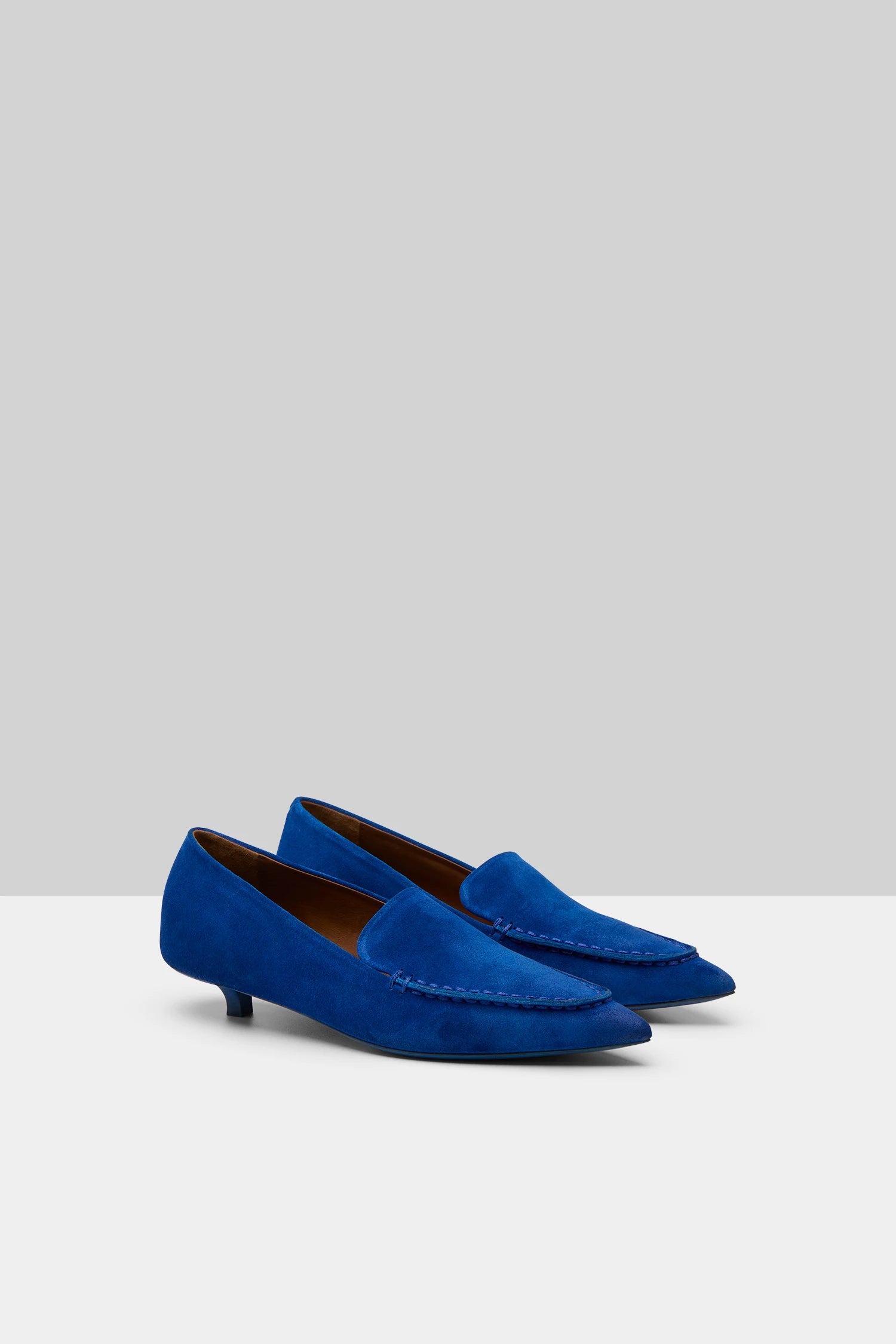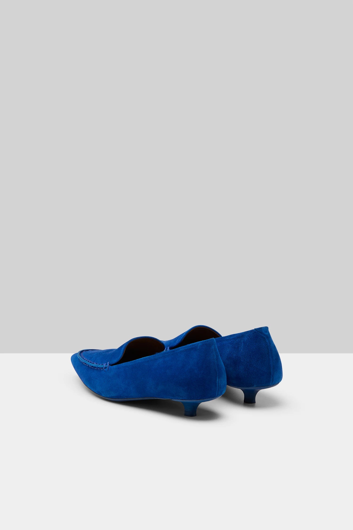 Spino Pumps in reversed leather in the color electric blue. The tapered silhouette of this pointed decollete, embellished with visible stitching that emphasises the craftsmanship, is enhanced by a leather-covered stiletto heel, defining an elegant and timeless femininity. The fluid profile of the heel, enhanced by a unique shade, speaks to meticulous attention to detail. The minimalist sole disappears to enhance the purity of the form, offering an essence of style that captures every look.