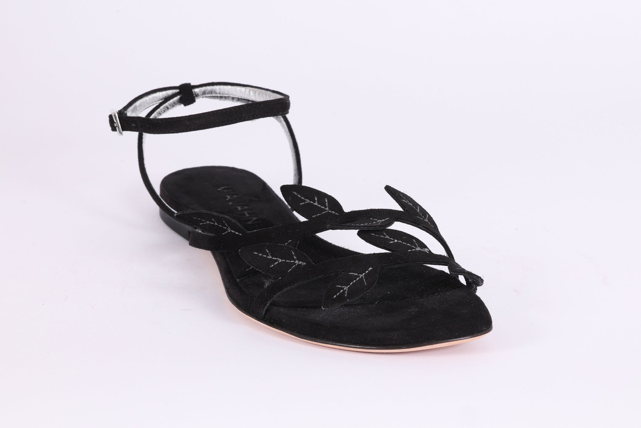 Minimalist black suede sandals with delicate leaf-shaped detailing and a flat sole. Designed for everyday elegance, they pair effortlessly with both casual and dressy outfits.