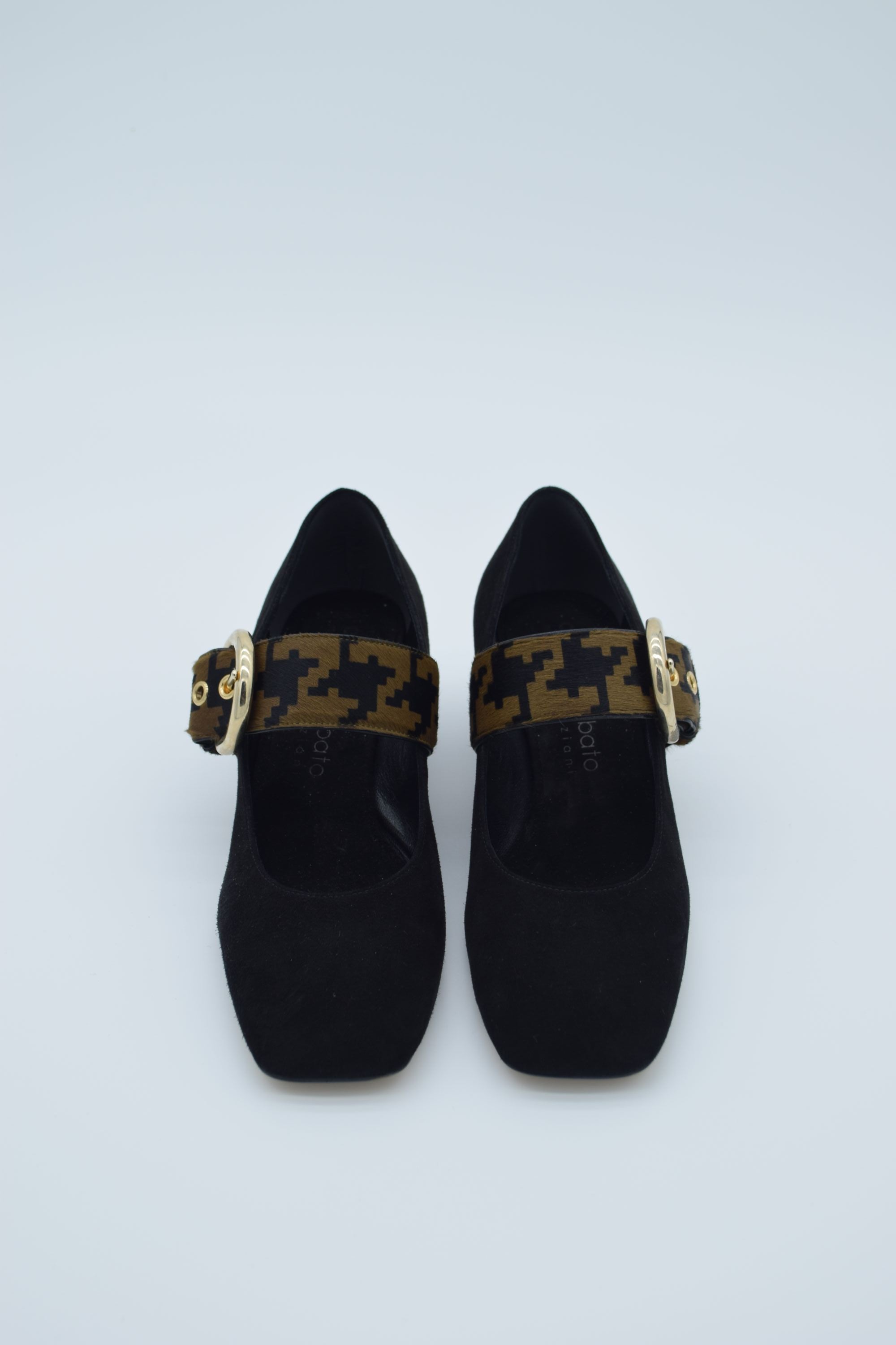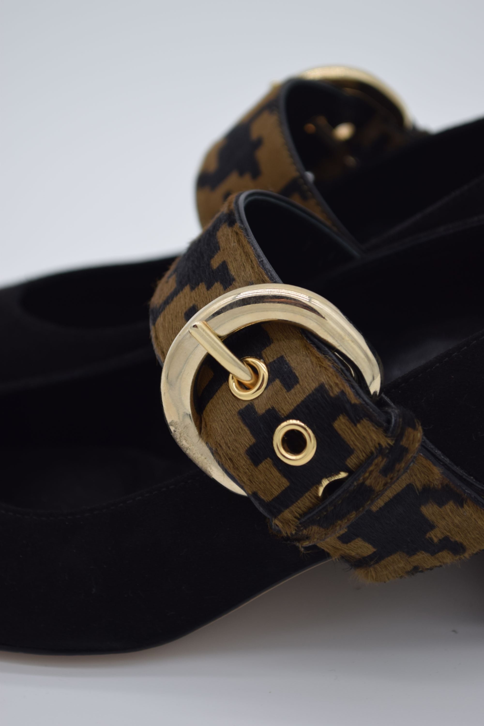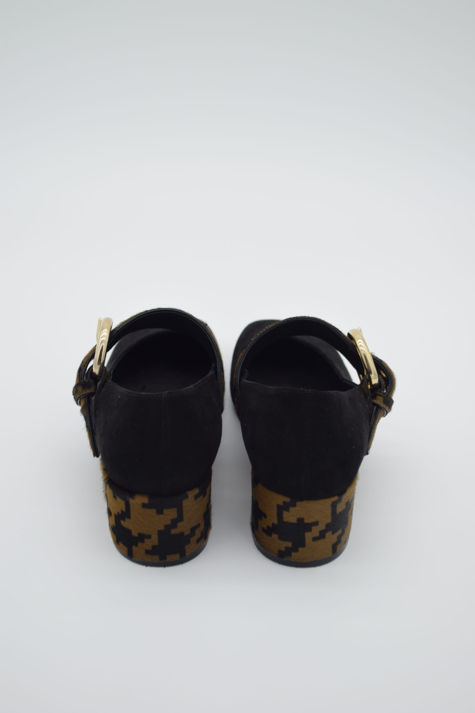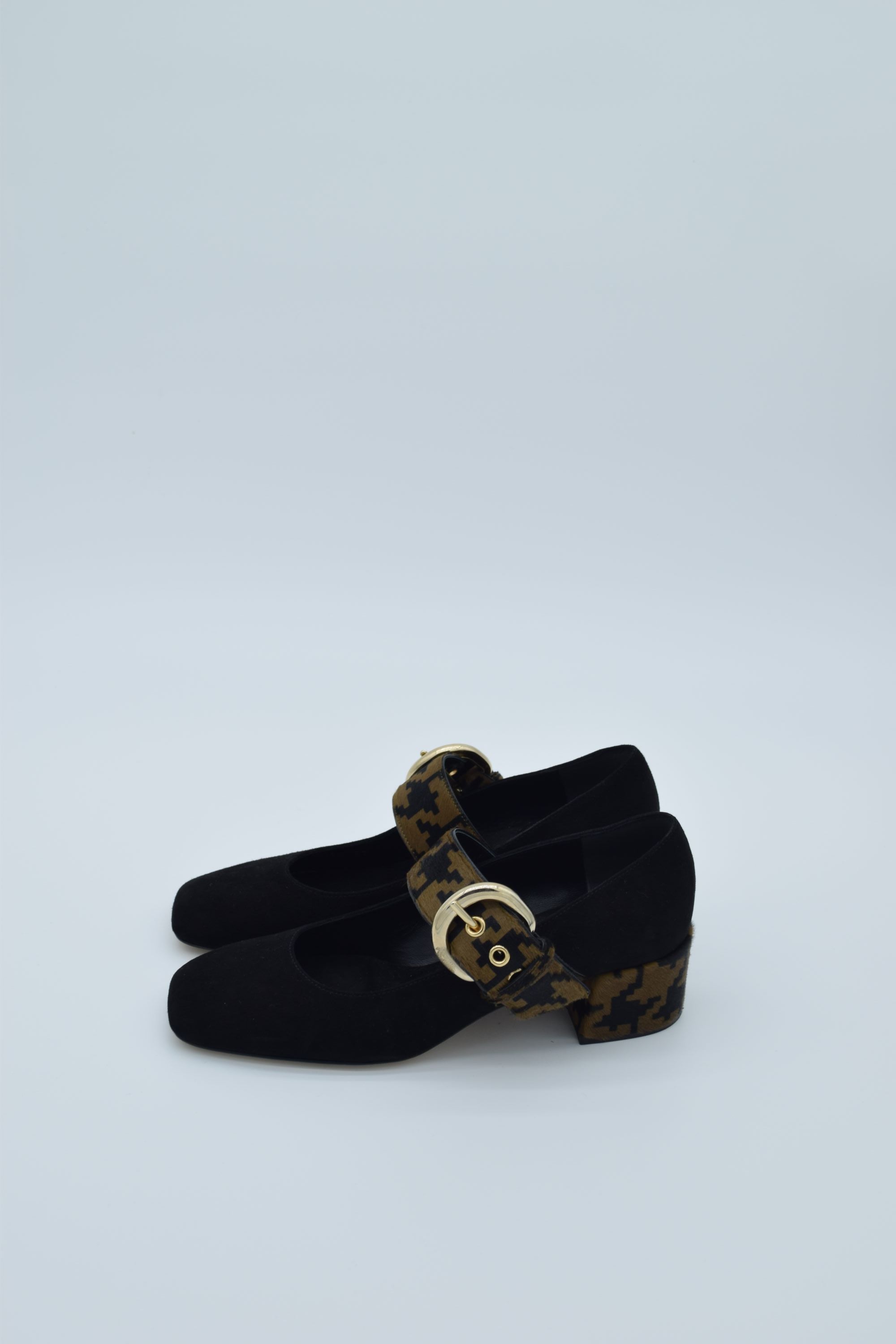 Classic black Mary Jane shoes featuring a bold patterned strap with a gold-tone buckle. Their timeless silhouette and comfortable design make them a stylish staple for any wardrobe.