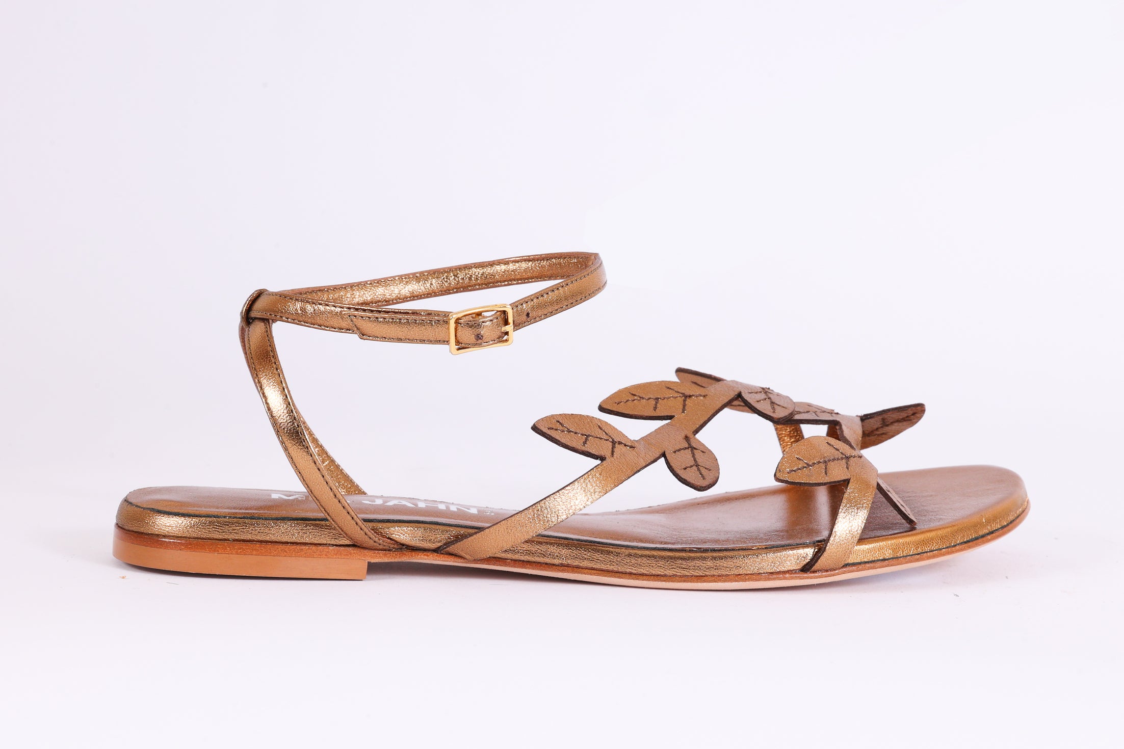 Chic flat sandals in metallic gold nappa leather, decorated with leaf-cut straps for a refined and feminine touch. Perfect for long summer walks while staying fashionable and comfortable.