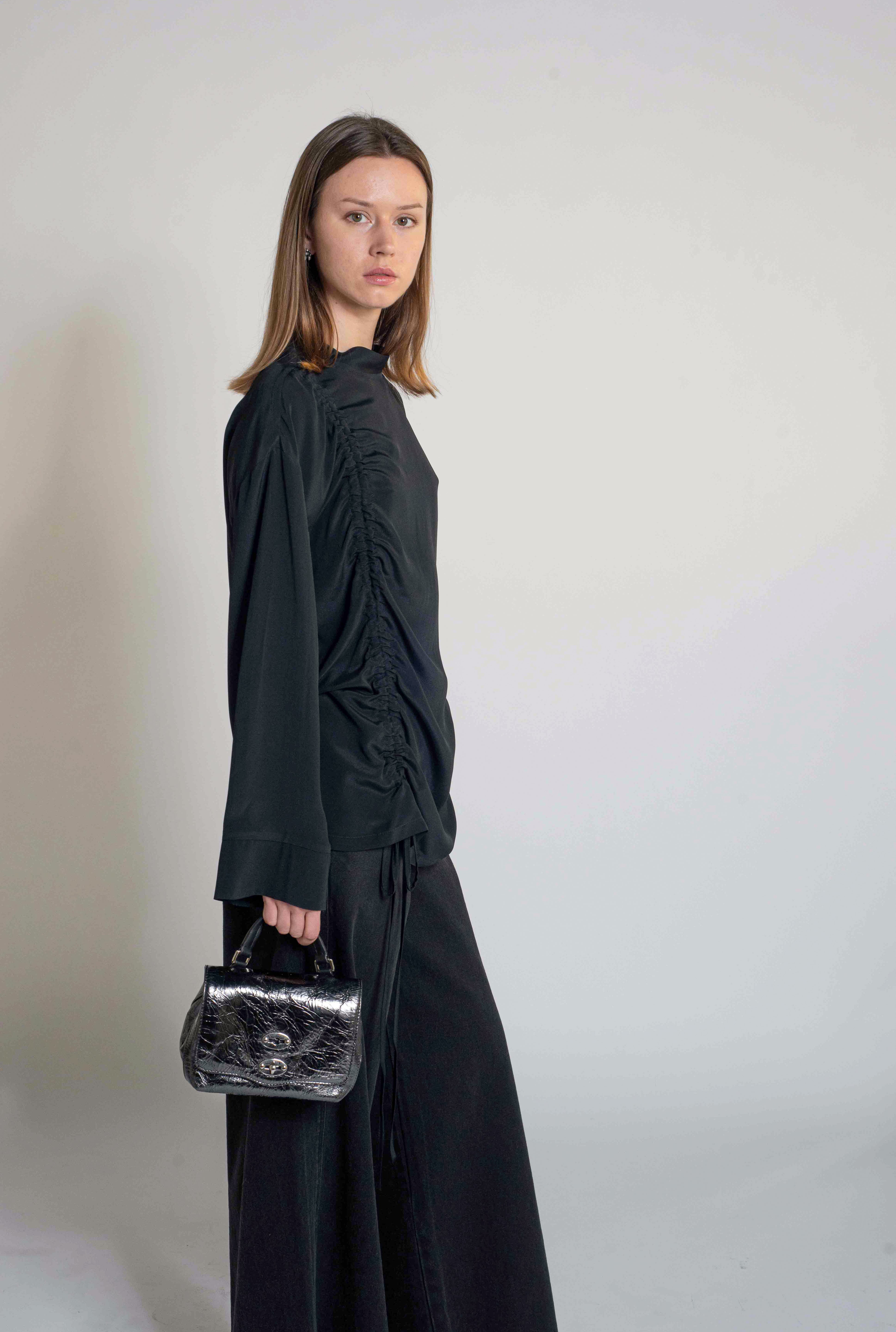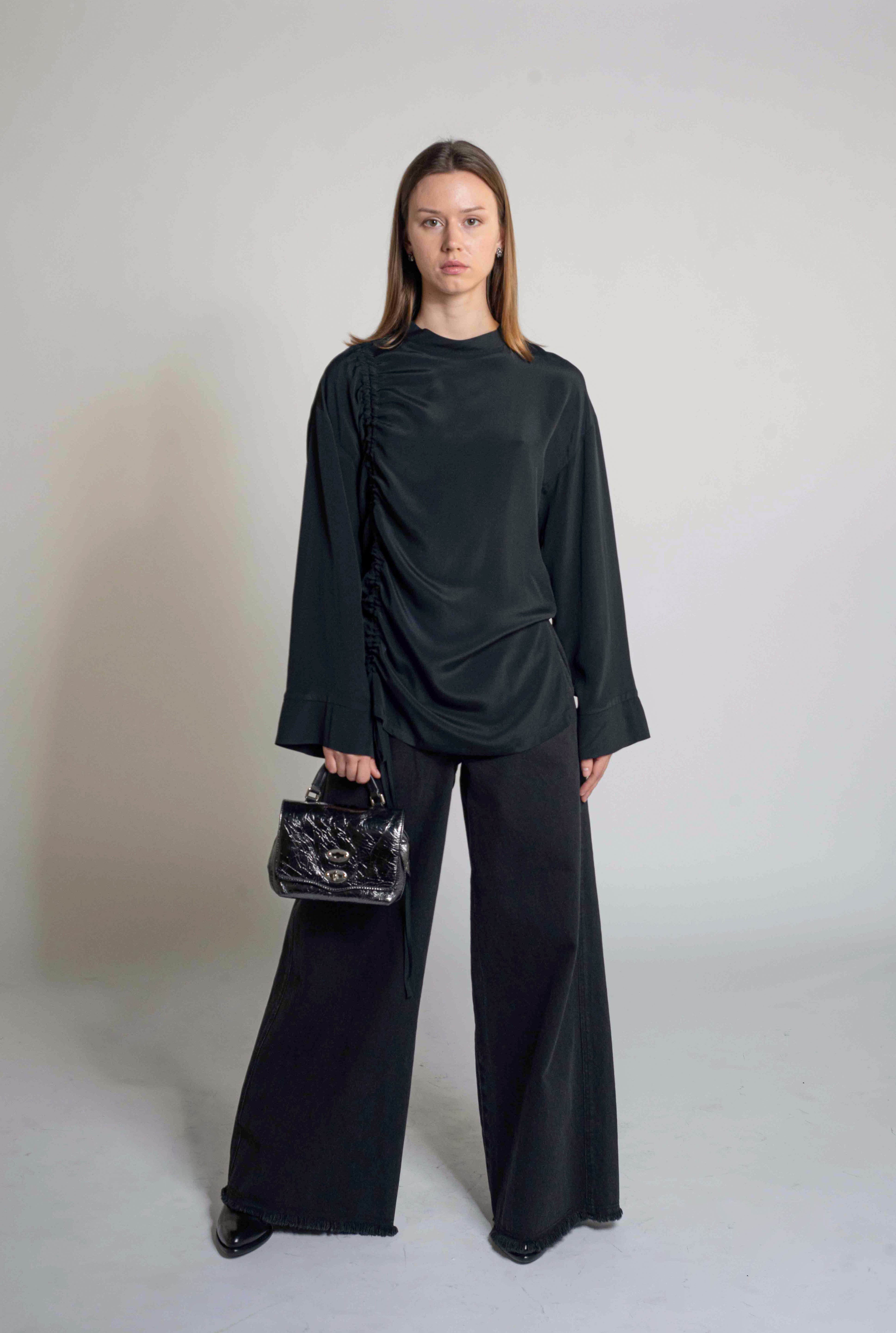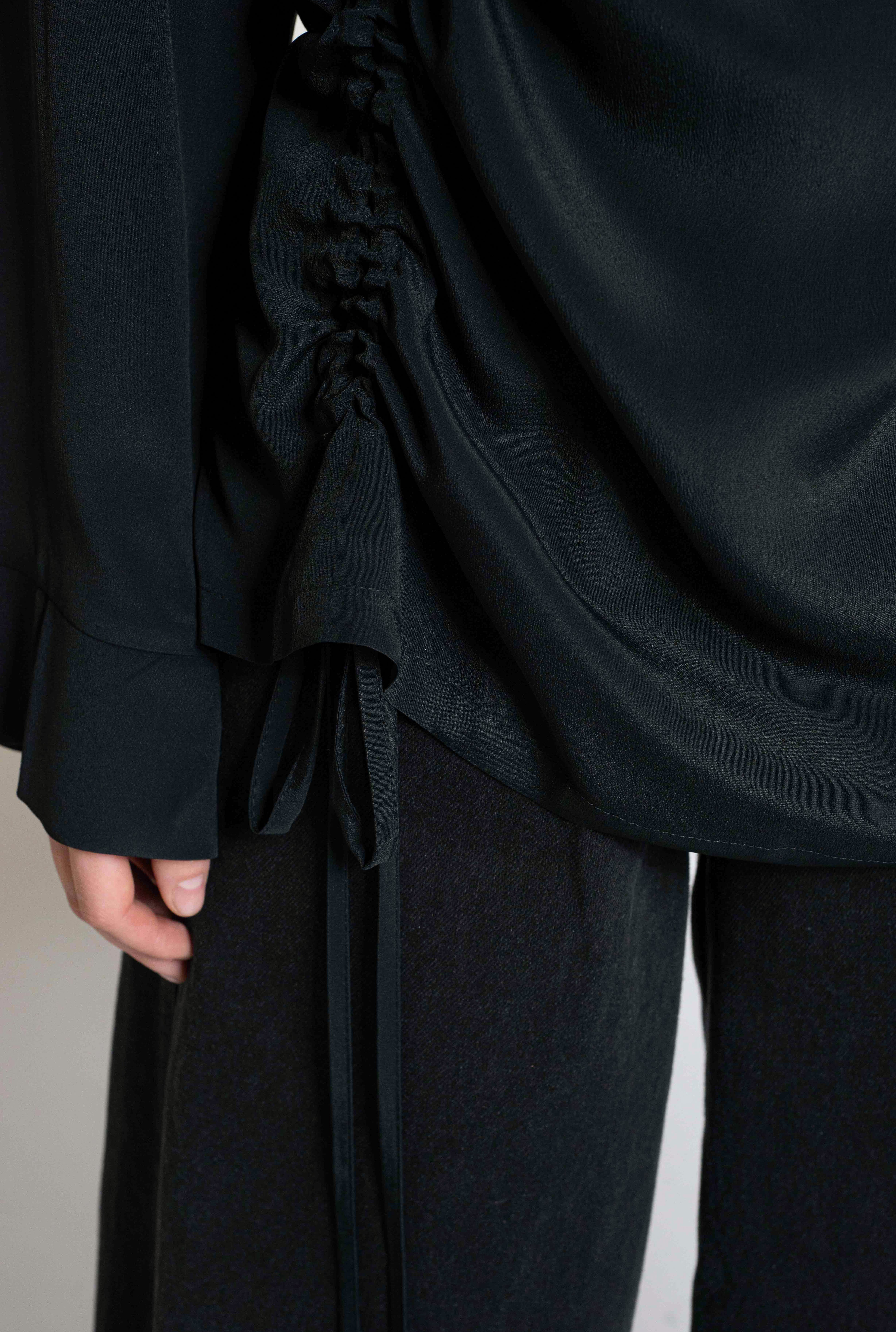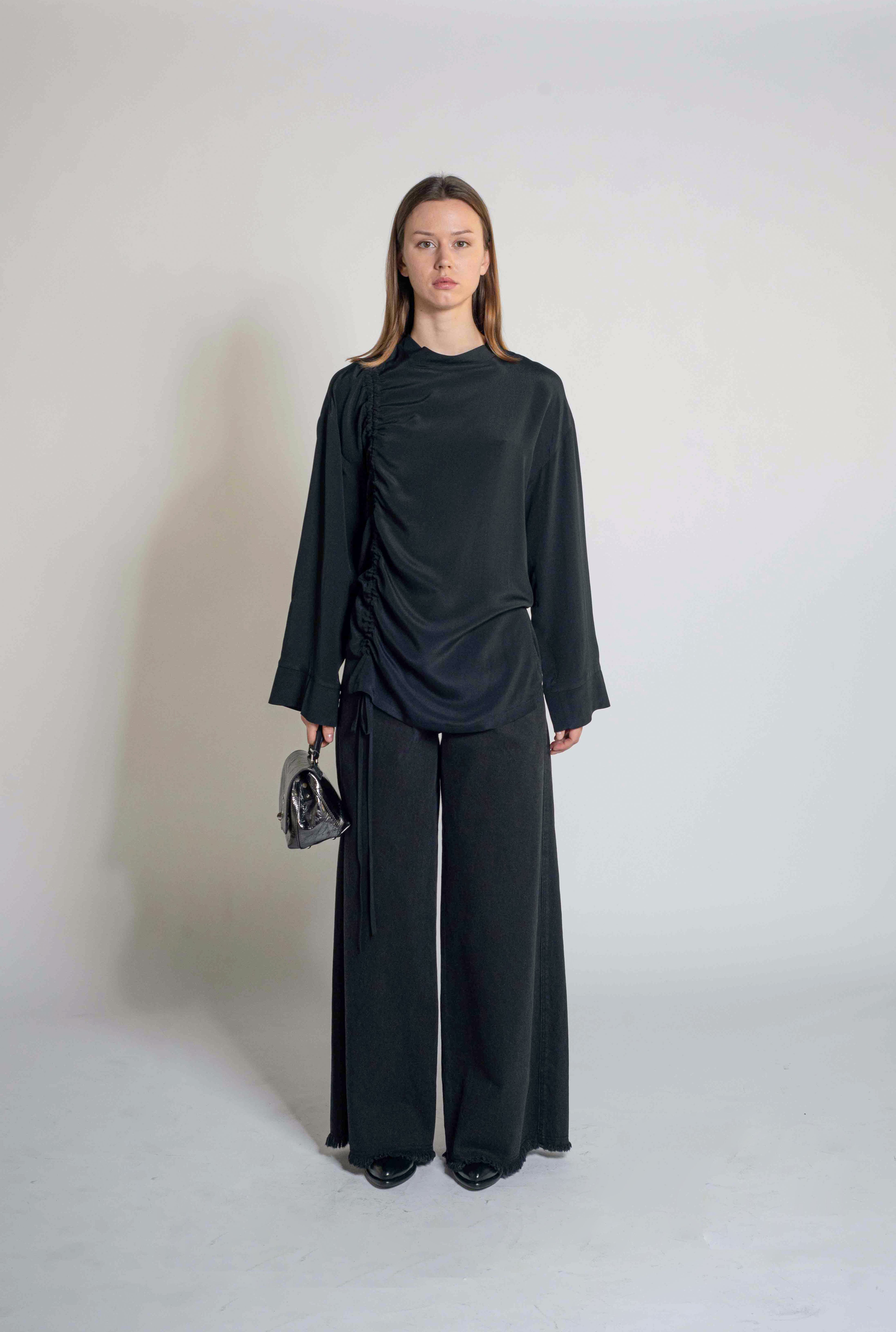 A sophisticated long-sleeve blouse featuring an asymmetric ruched detail on one side, adding modern elegance to a classic silhouette. Crafted from fluid, lightweight fabric for a comfortable yet refined fit. Versatile for both formal and evening looks.