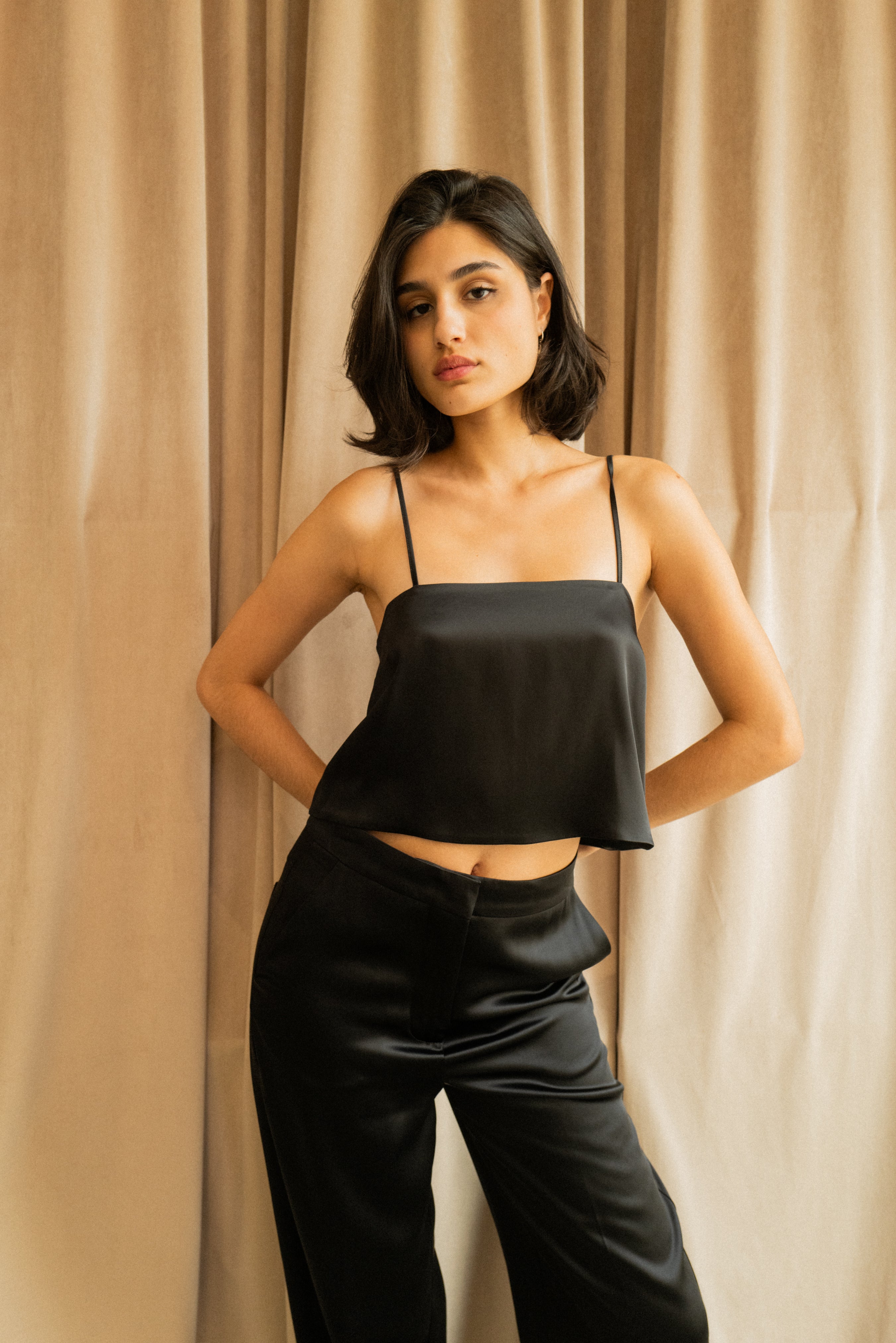 A black satin top featuring thin adjustable straps and an open back with delicate tie detailing. Elegant and versatile for both casual and evening looks.