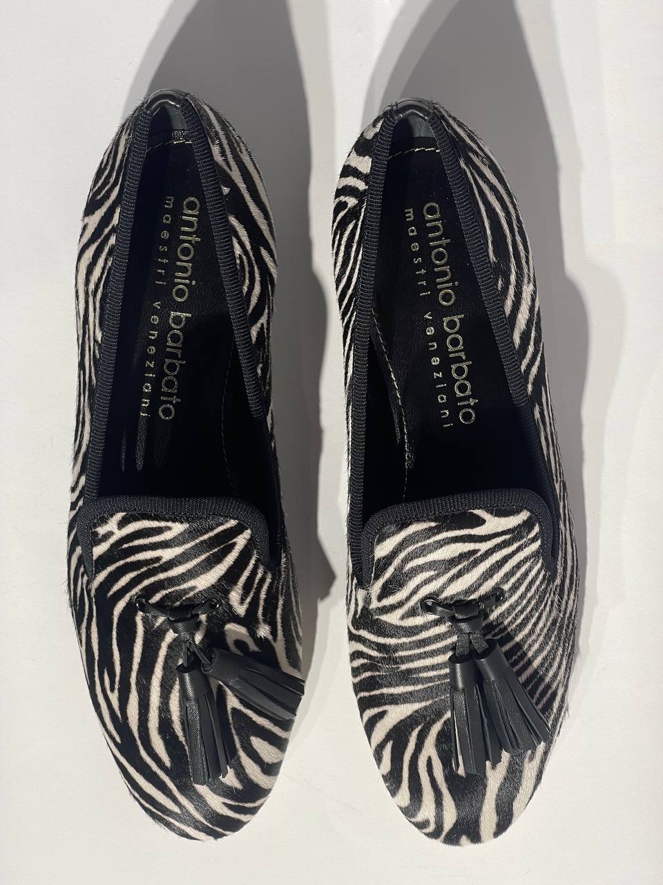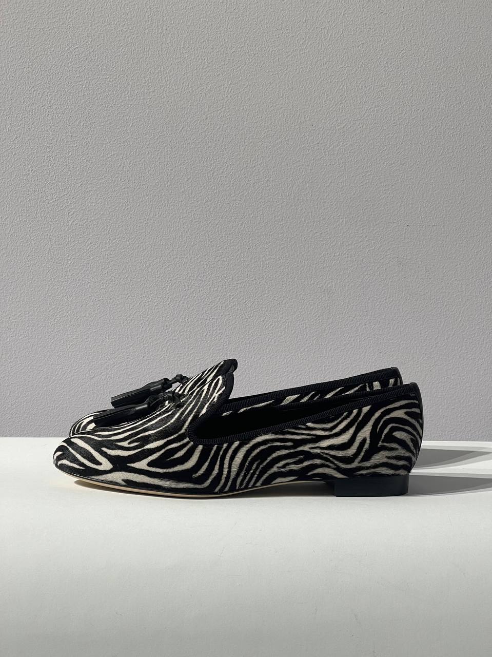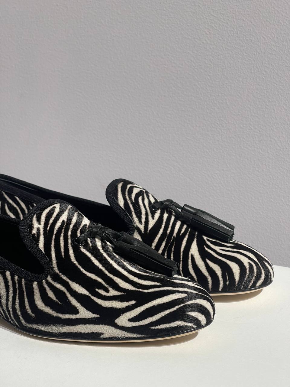 Eye-catching loafers made from pony-style leather with a bold zebra print. Their unique texture and comfortable fit add a playful yet chic touch to any outfit.