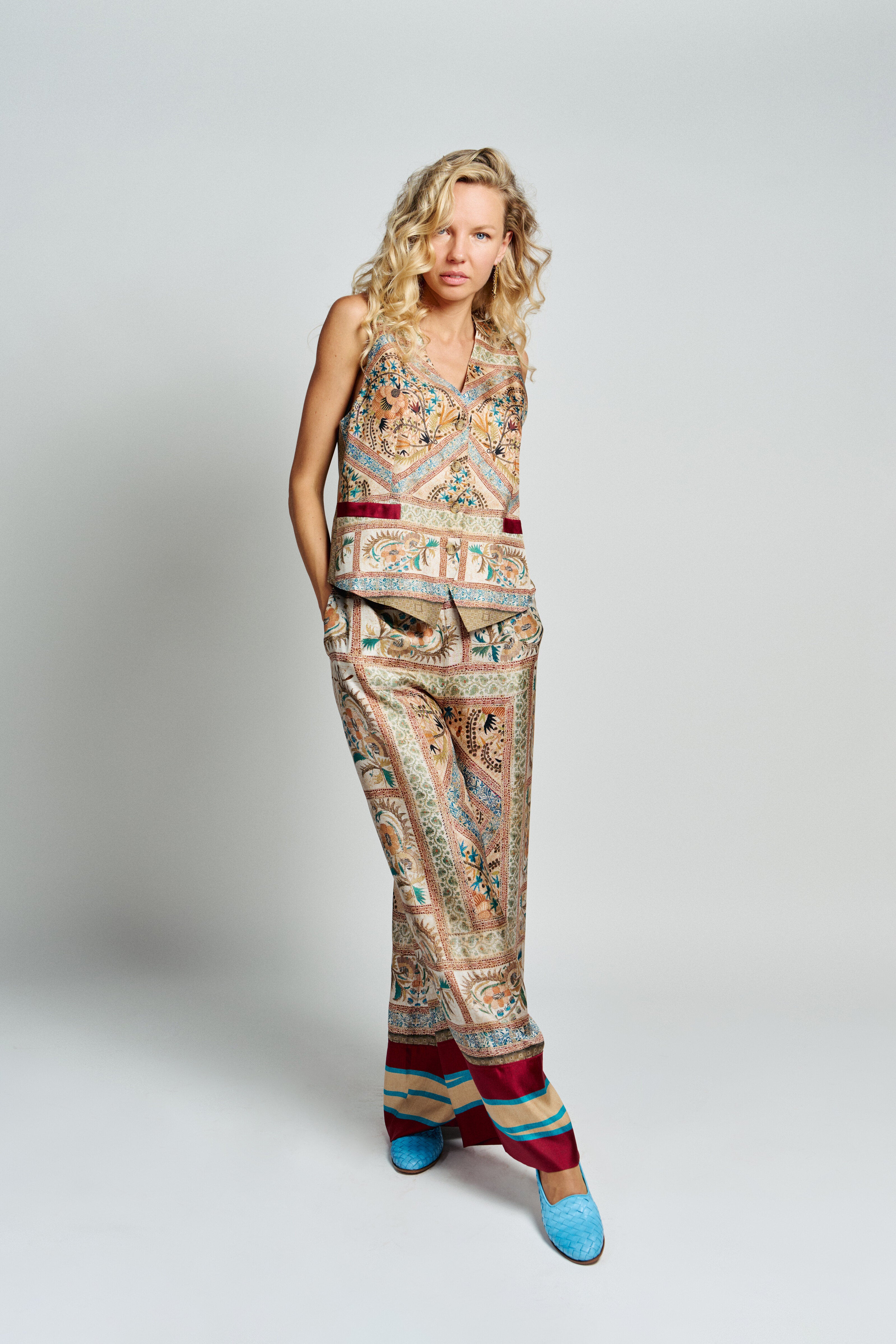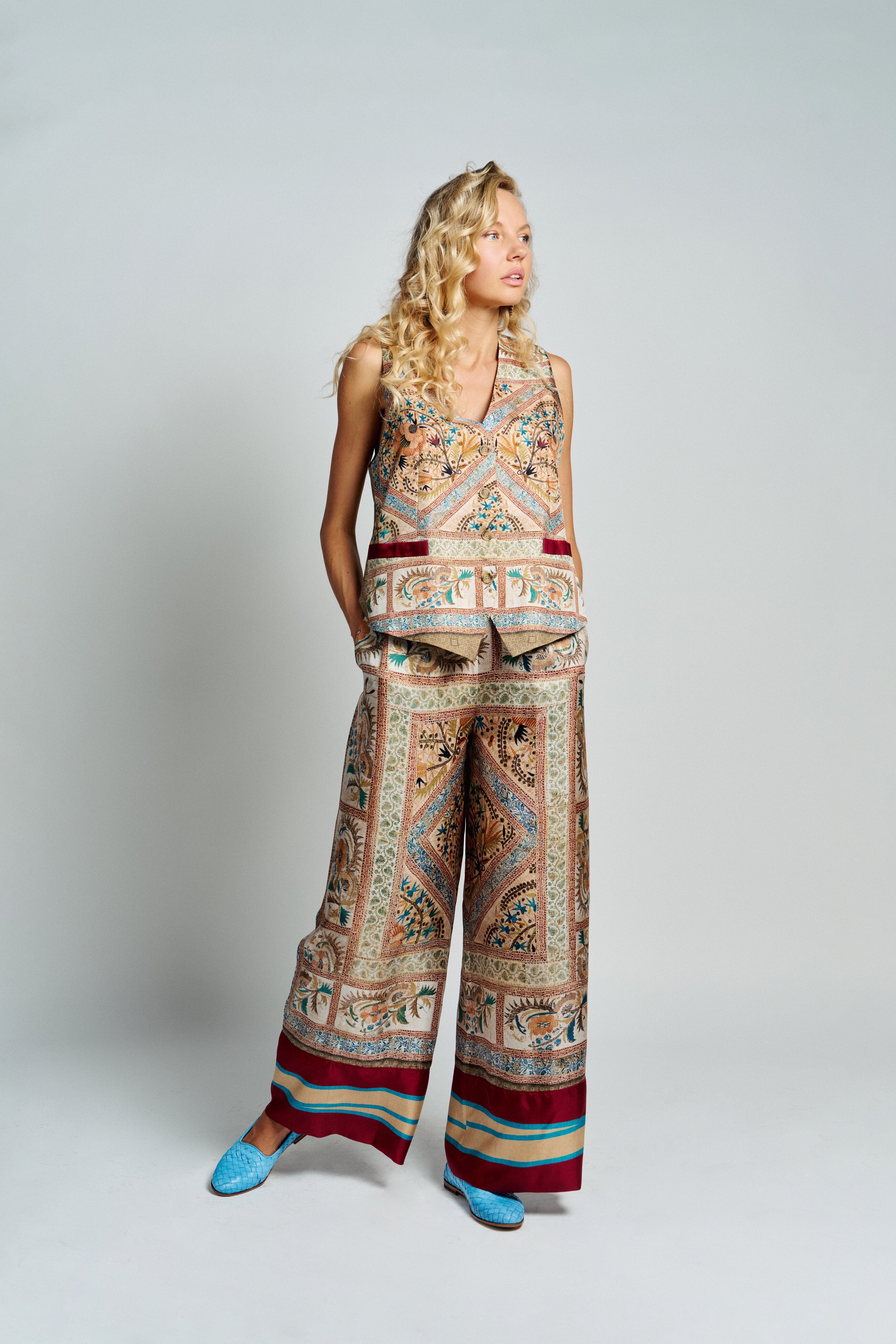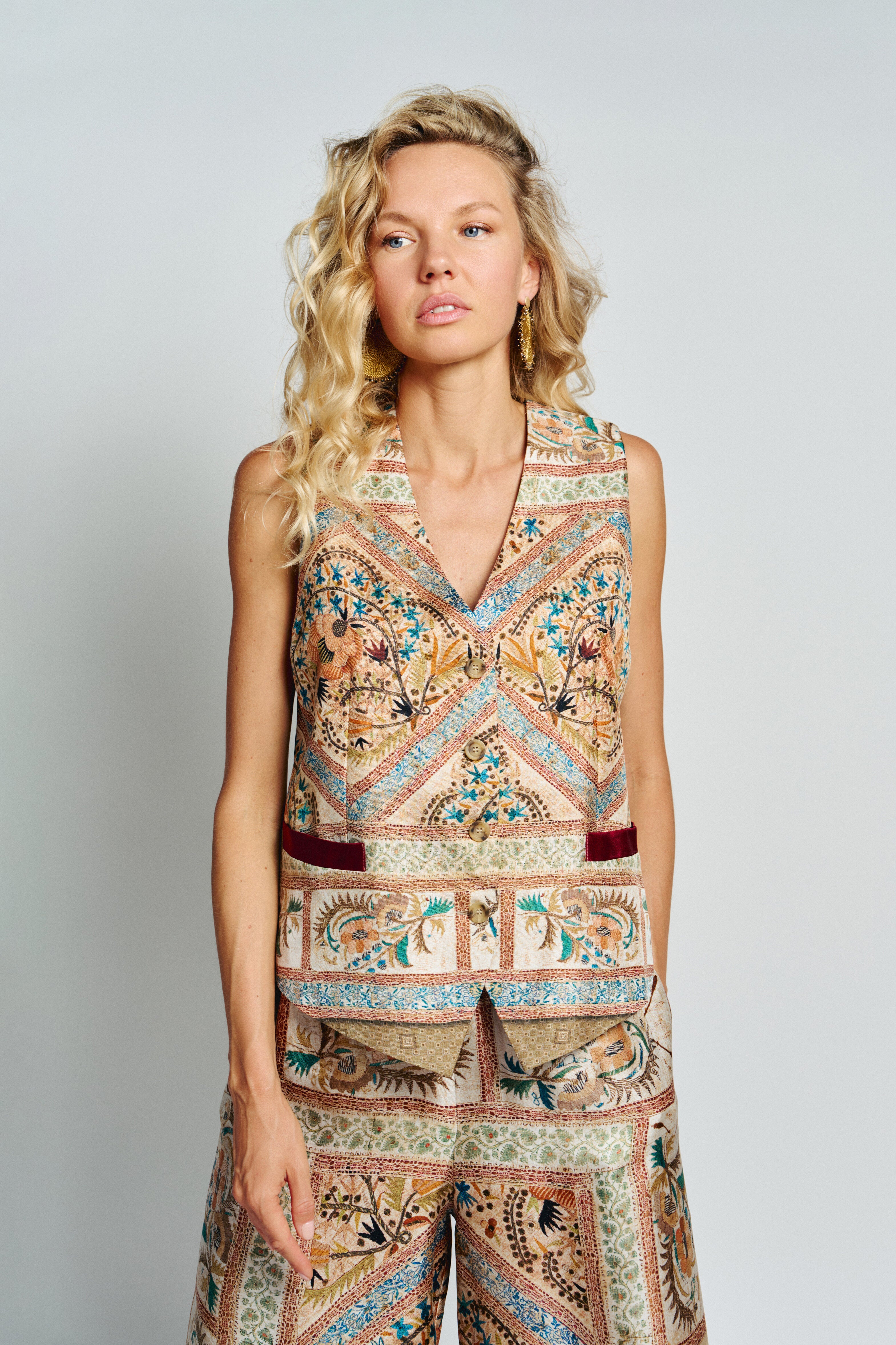 Crafted from 100% silk, this tailored vest by Pierre-Louis Mascia features a bold, tapestry-inspired print in earthy tones with vibrant accents. Its structured silhouette and deep V-neckline create a refined yet artistic feel. Wear it solo or layered over a shirt for an elevated, statement look.