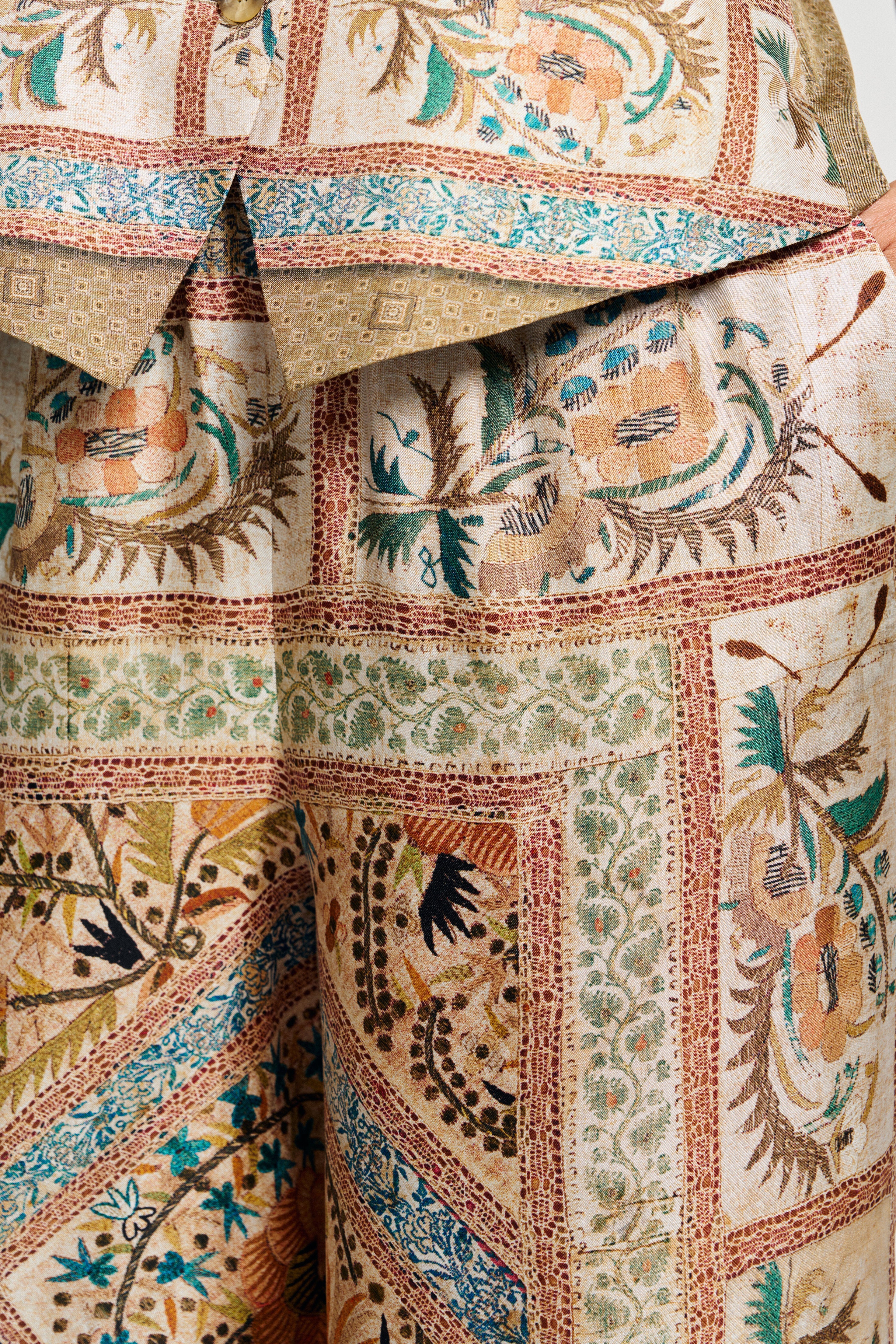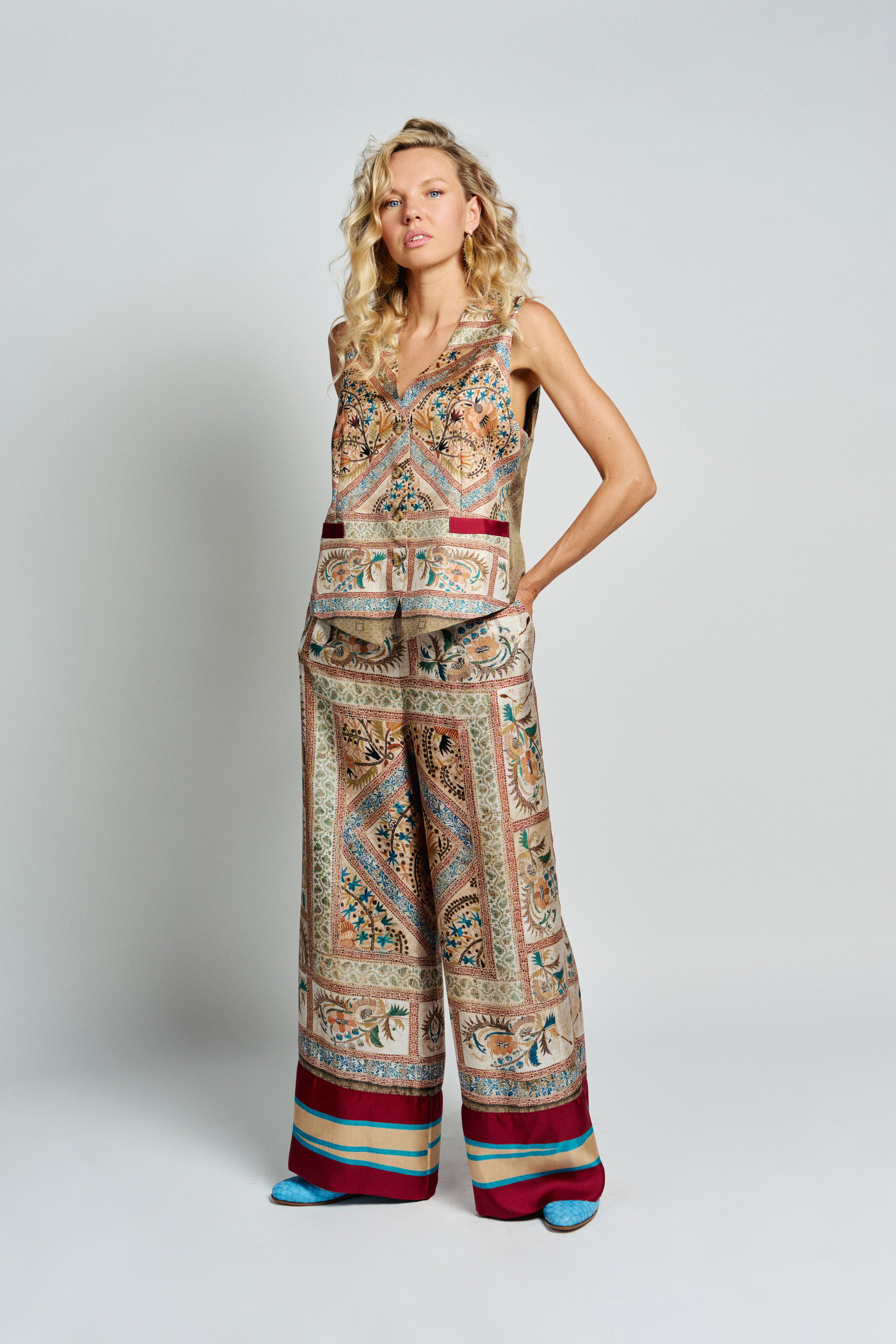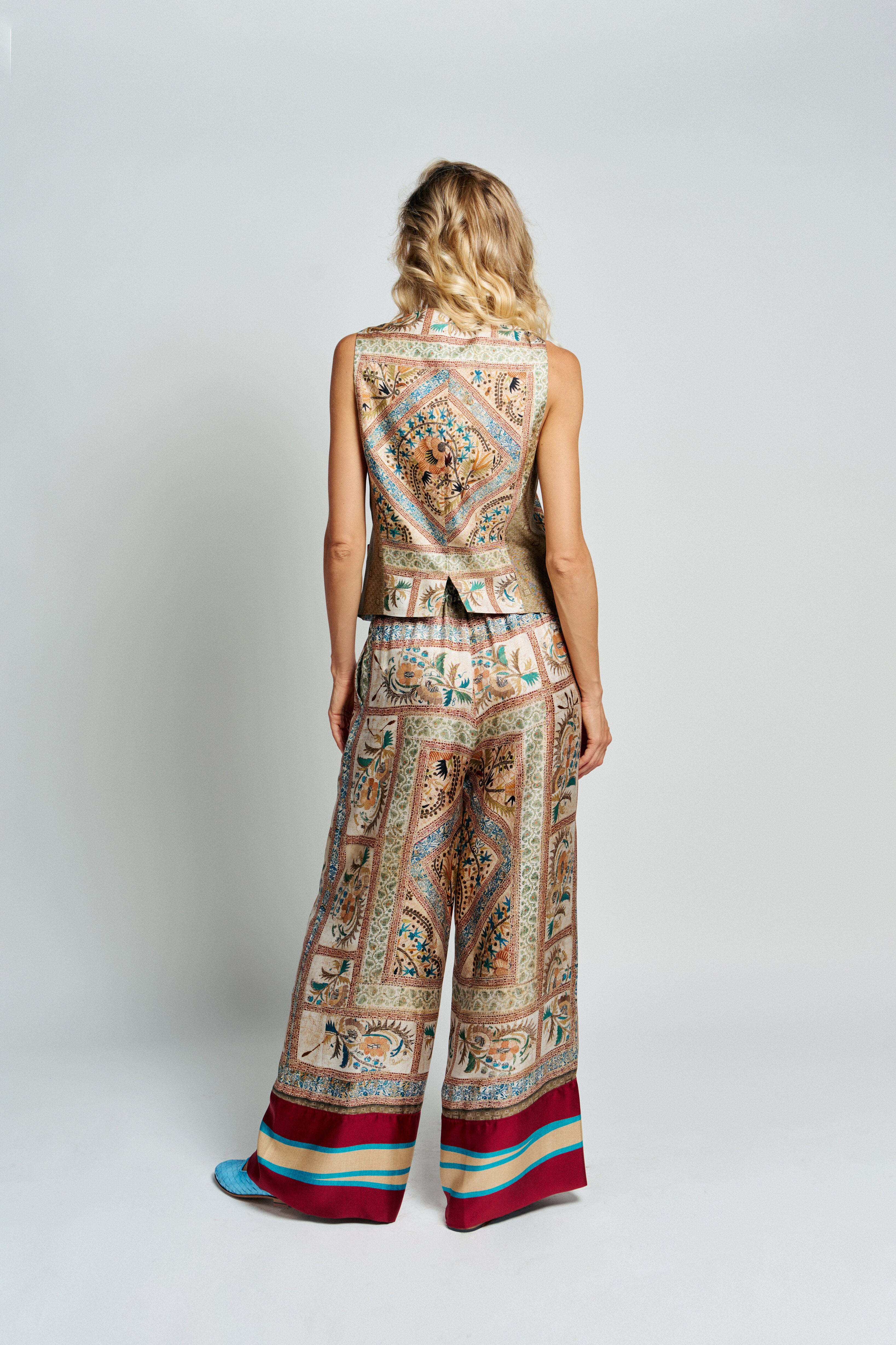 Crafted from 100% silk, this tailored vest by Pierre-Louis Mascia features a bold, tapestry-inspired print in earthy tones with vibrant accents. Its structured silhouette and deep V-neckline create a refined yet artistic feel. Wear it solo or layered over a shirt for an elevated, statement look.