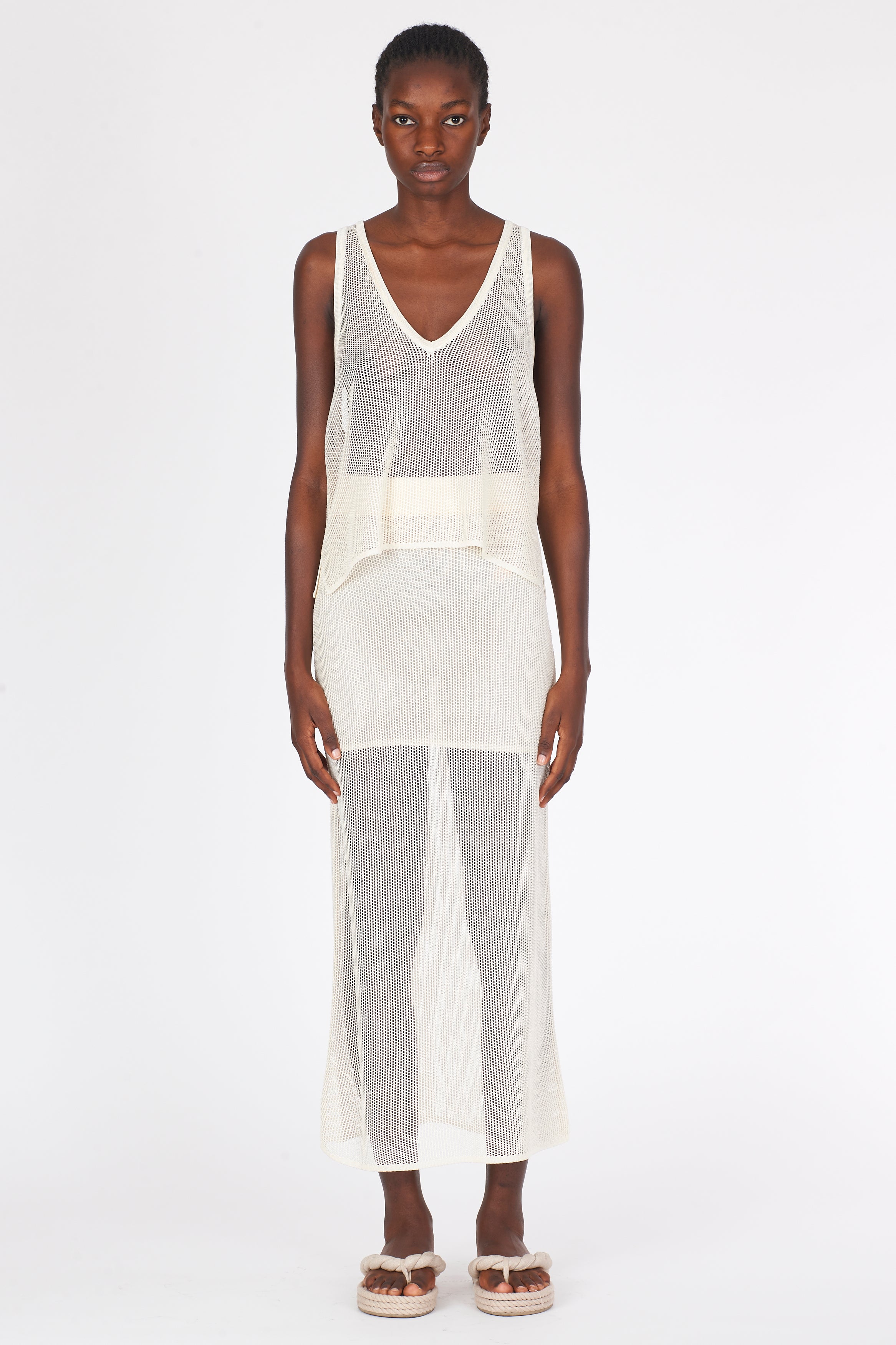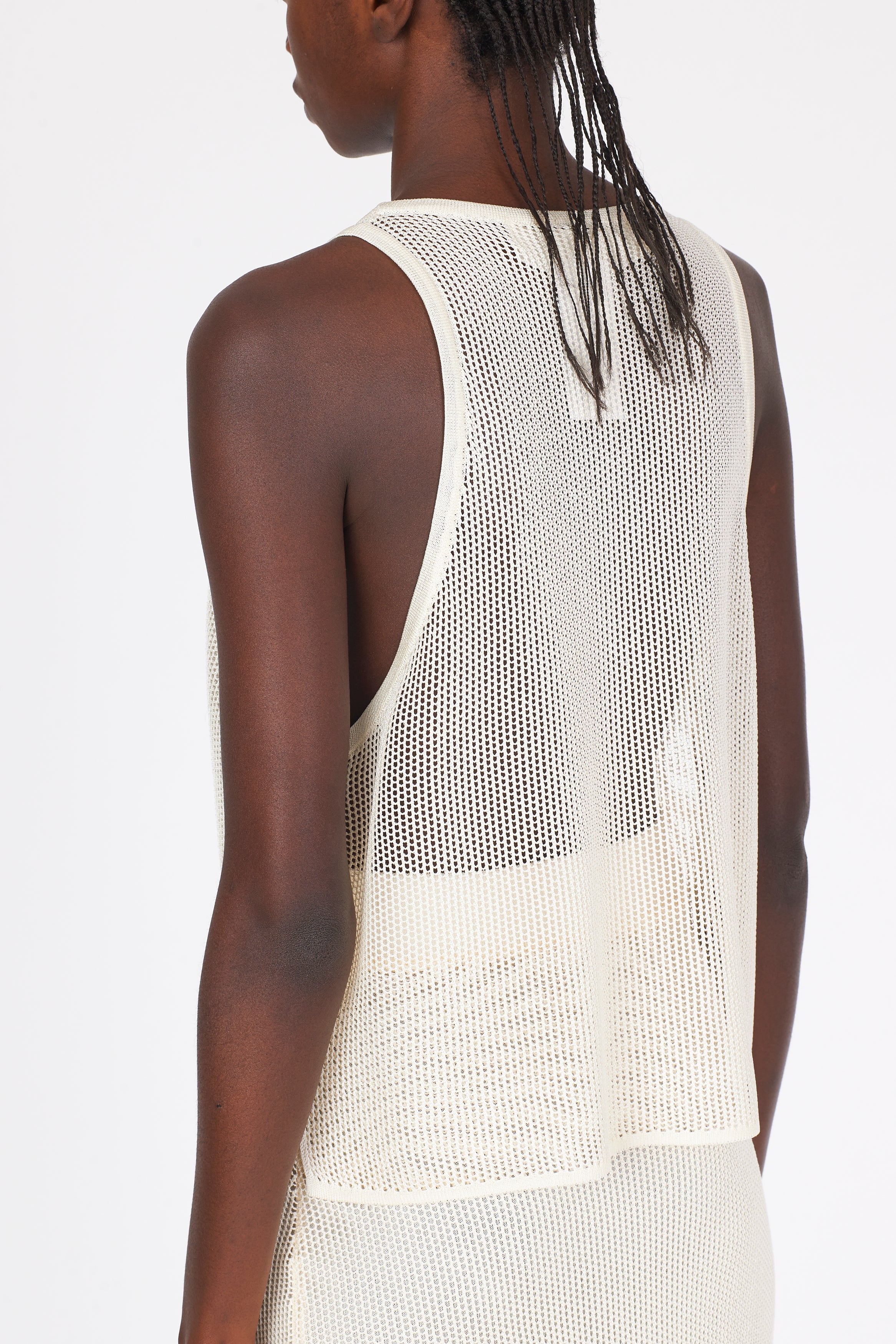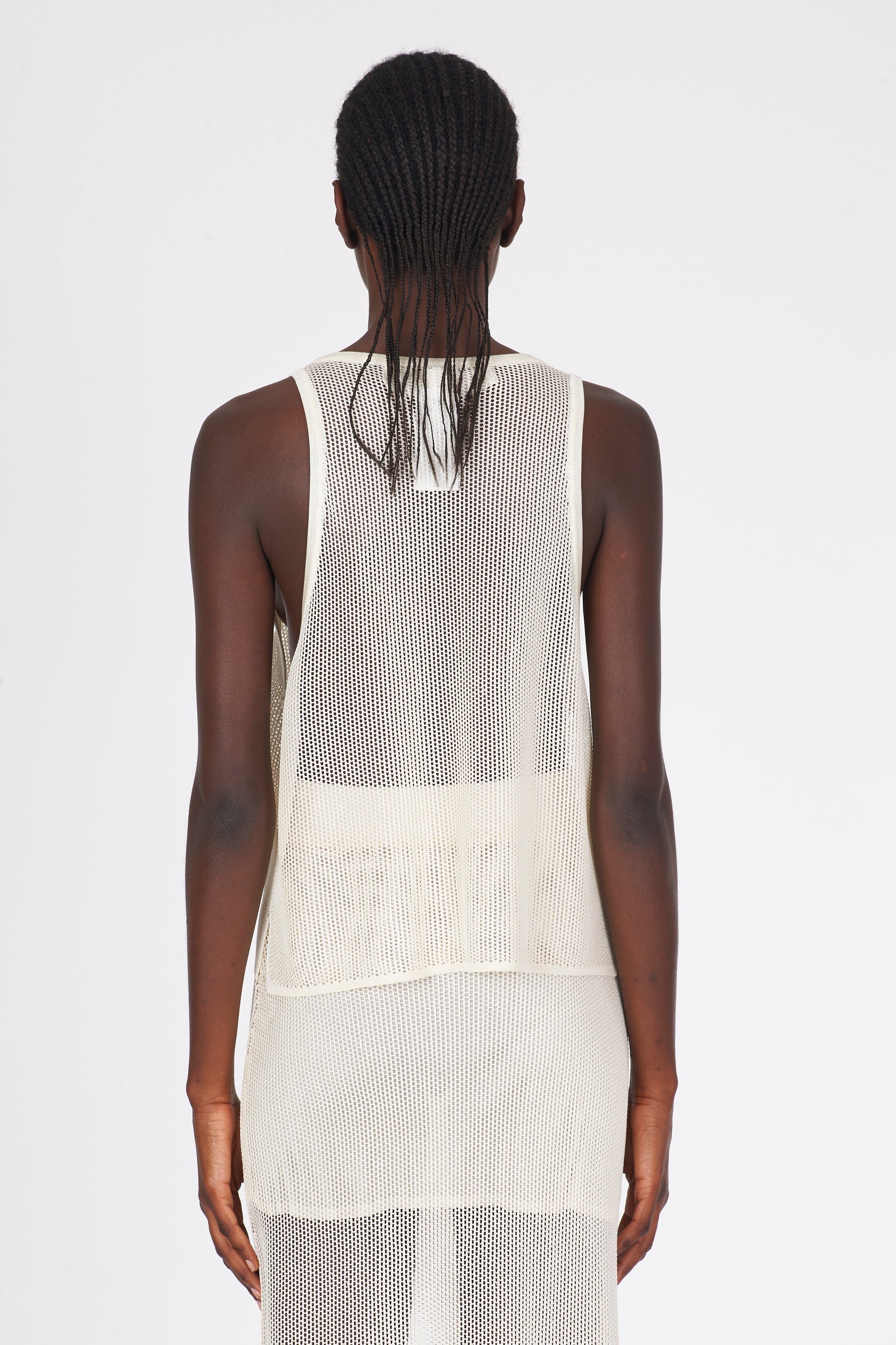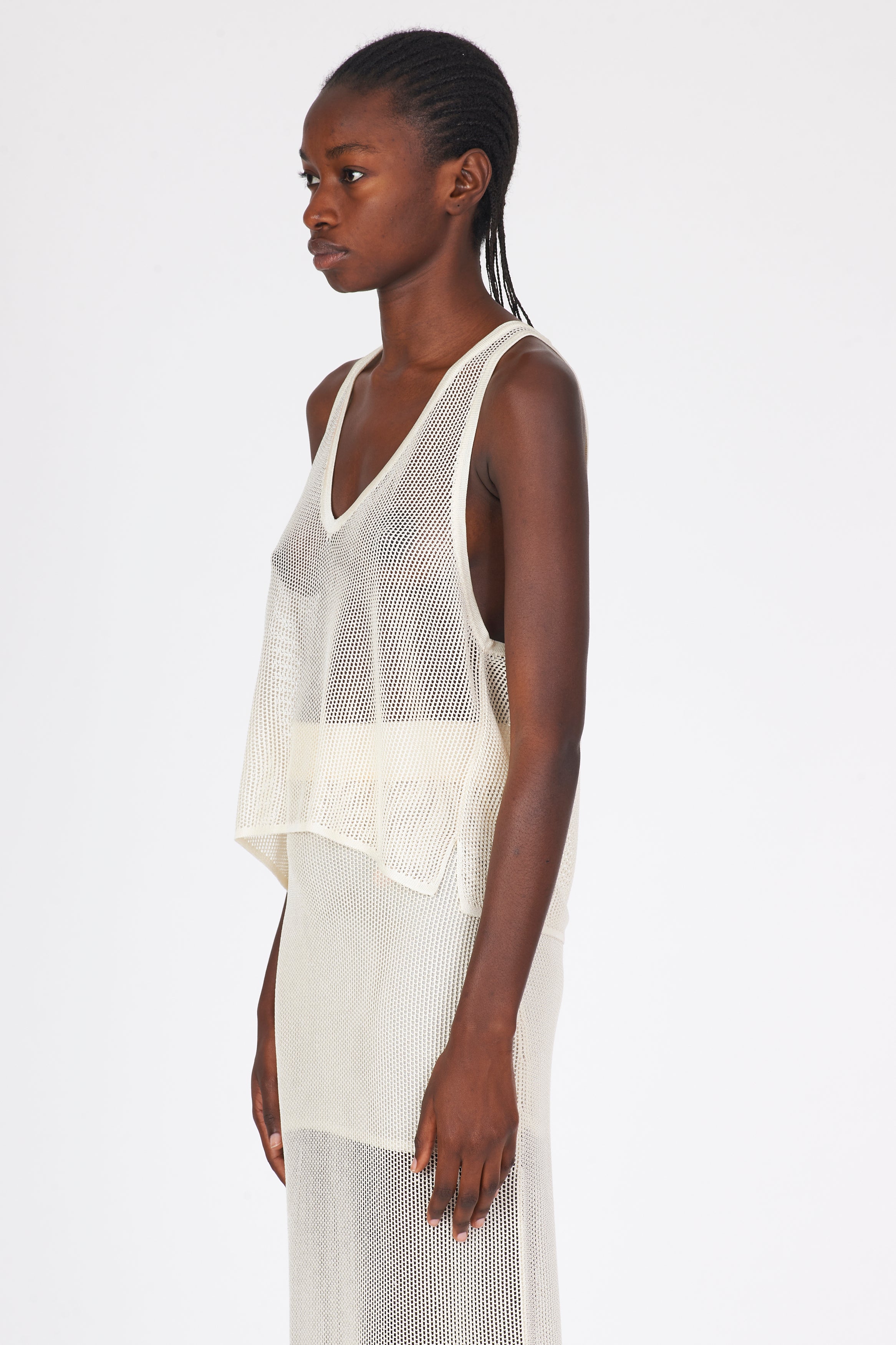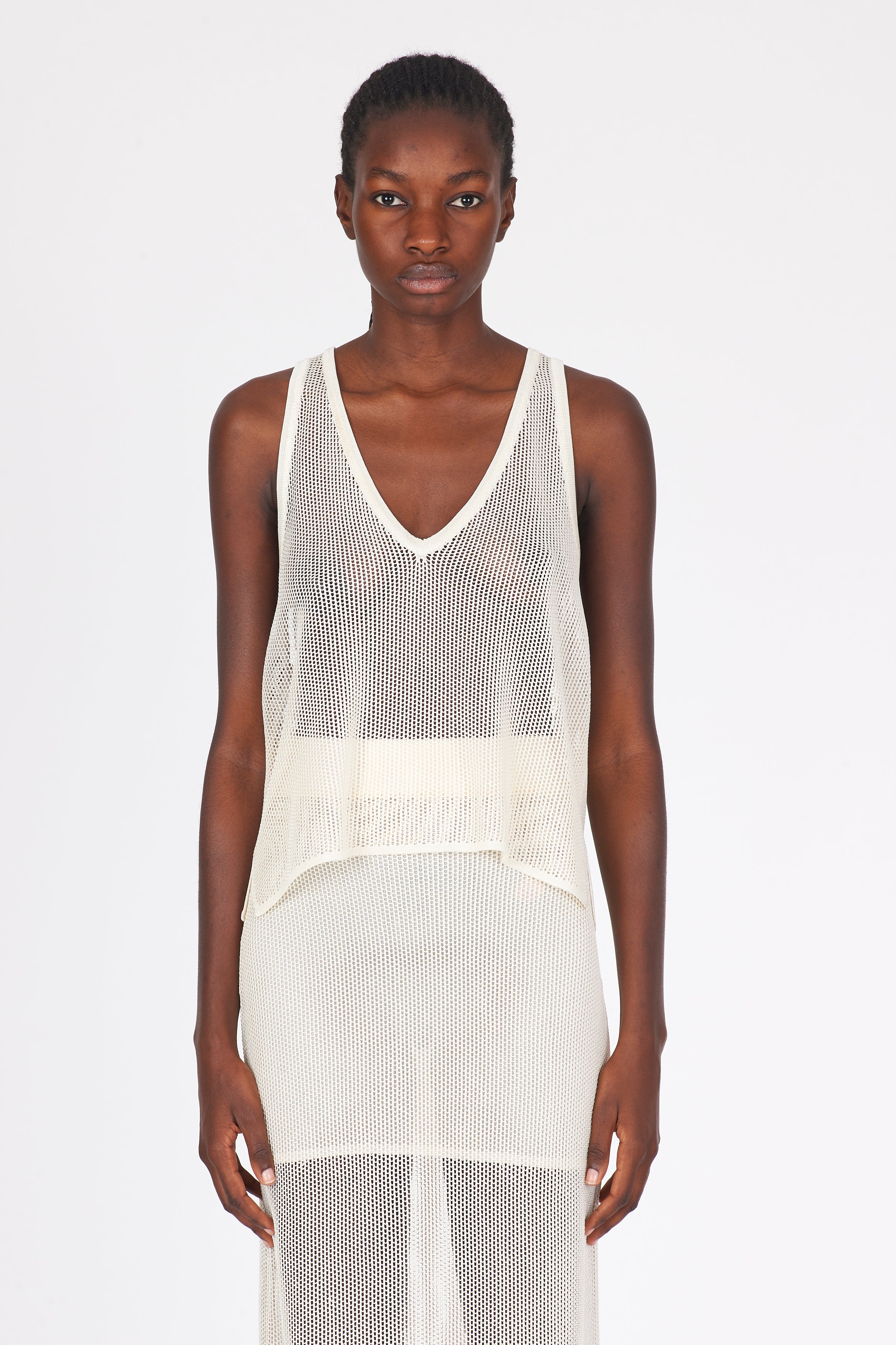A semi-sheer tank top crafted from a delicate shiny mesh with a deep V-neckline. Perfect for layering, adding lightness and an airy touch to your look.