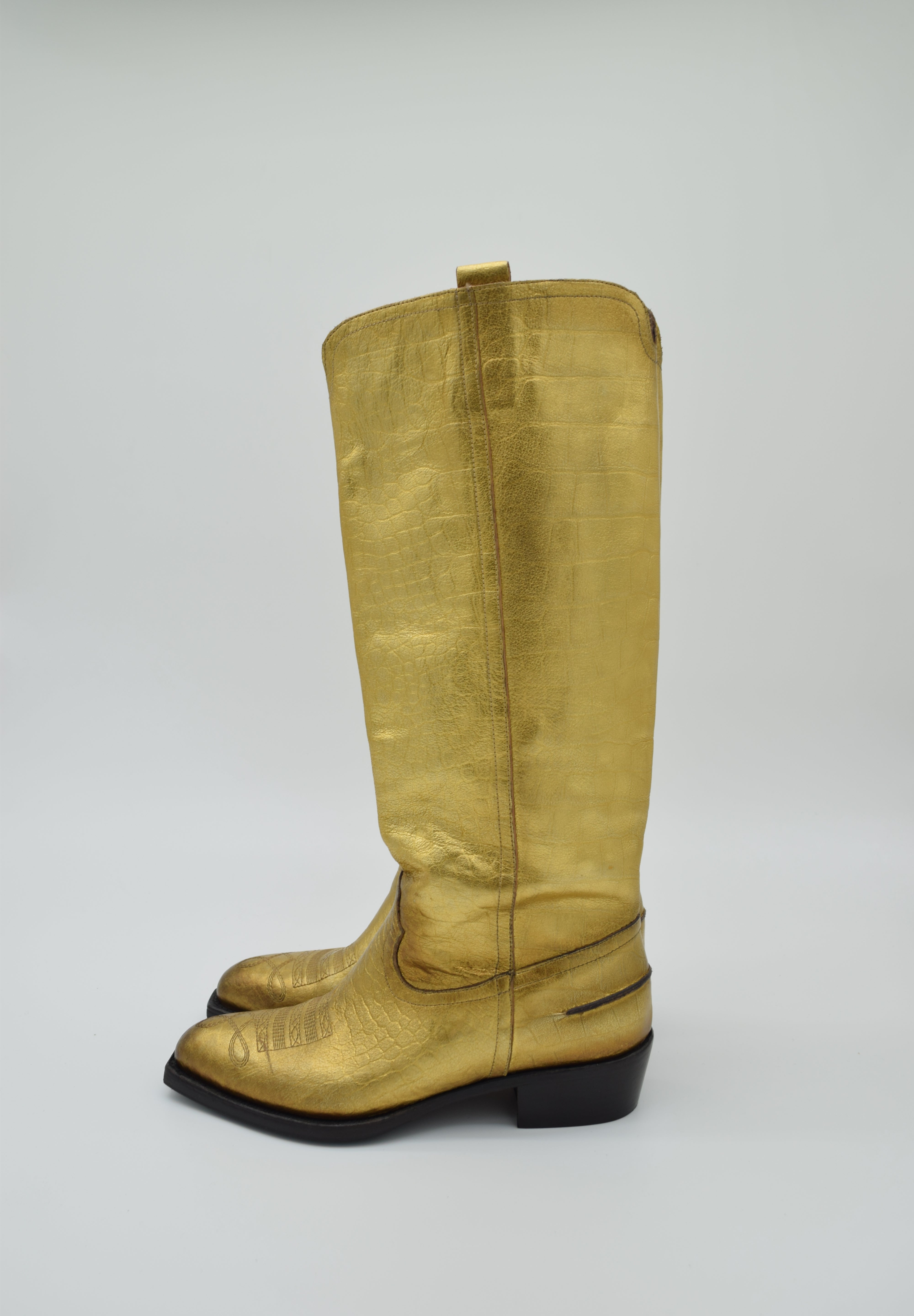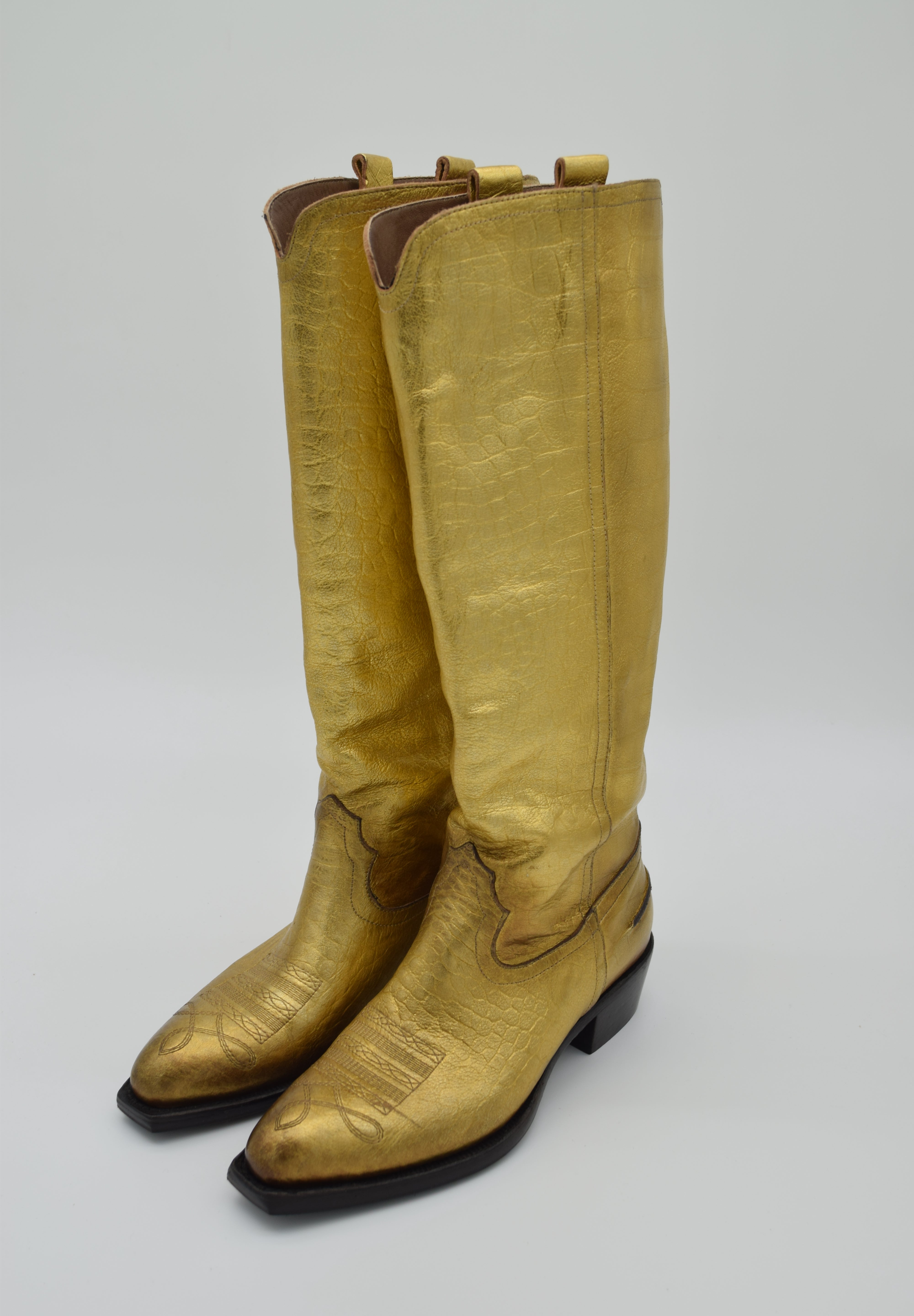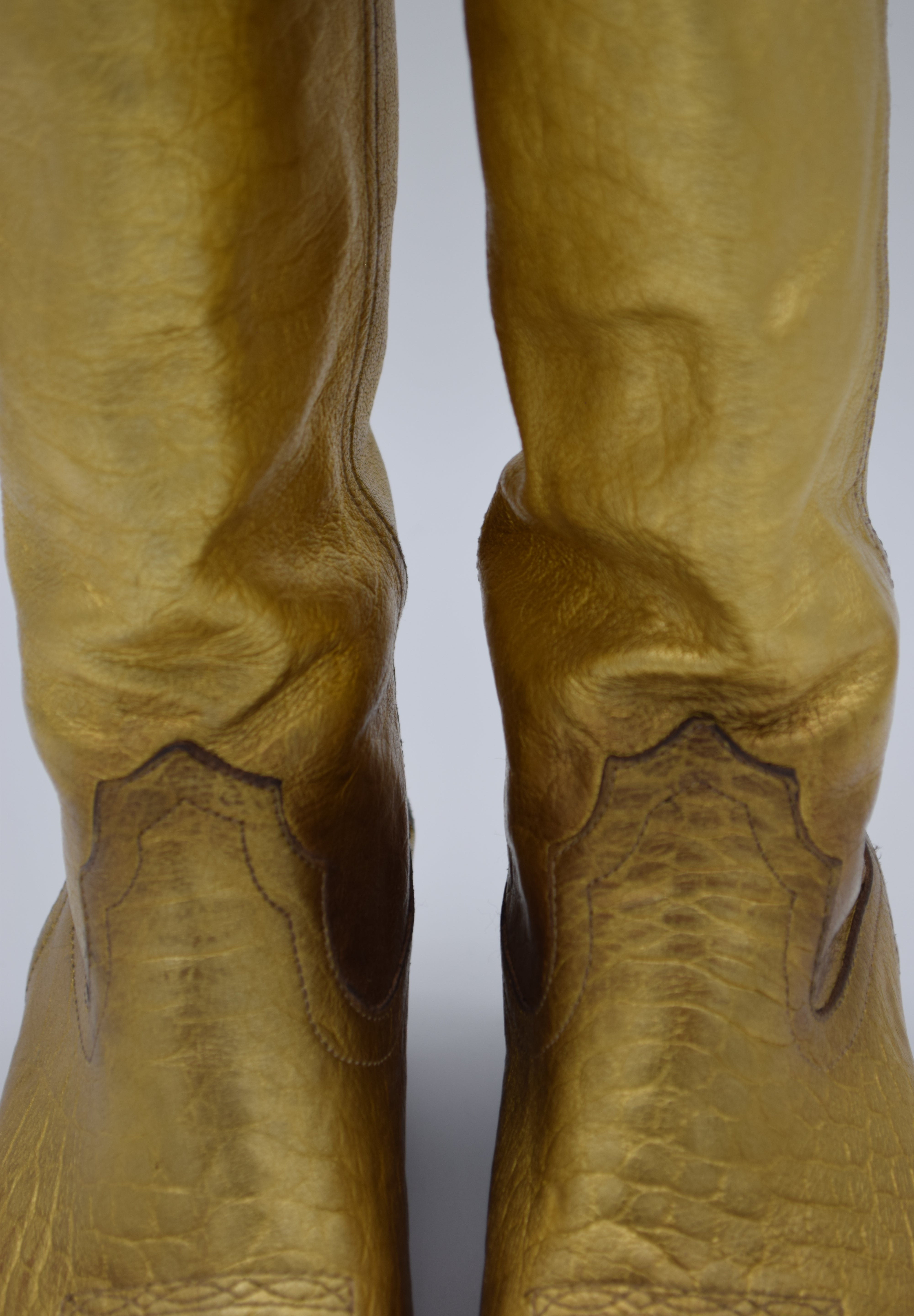 Statement high knee boots from Alexander Hotto, expertly crafted in Italy from supple leather with a subtle metallic finish. Perfect for bold, stylish looks and transitional seasons. Available in a luxurious golden tone.