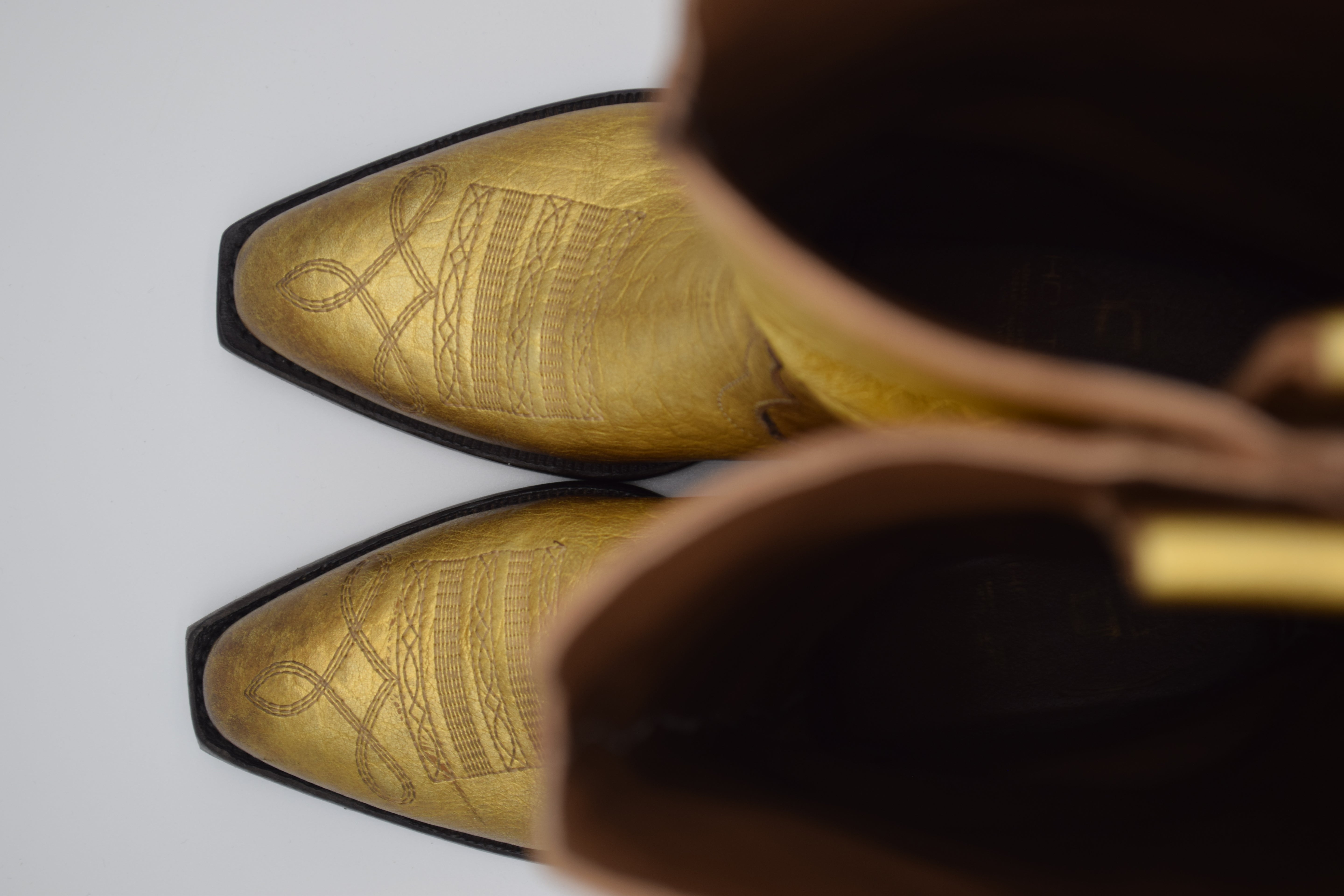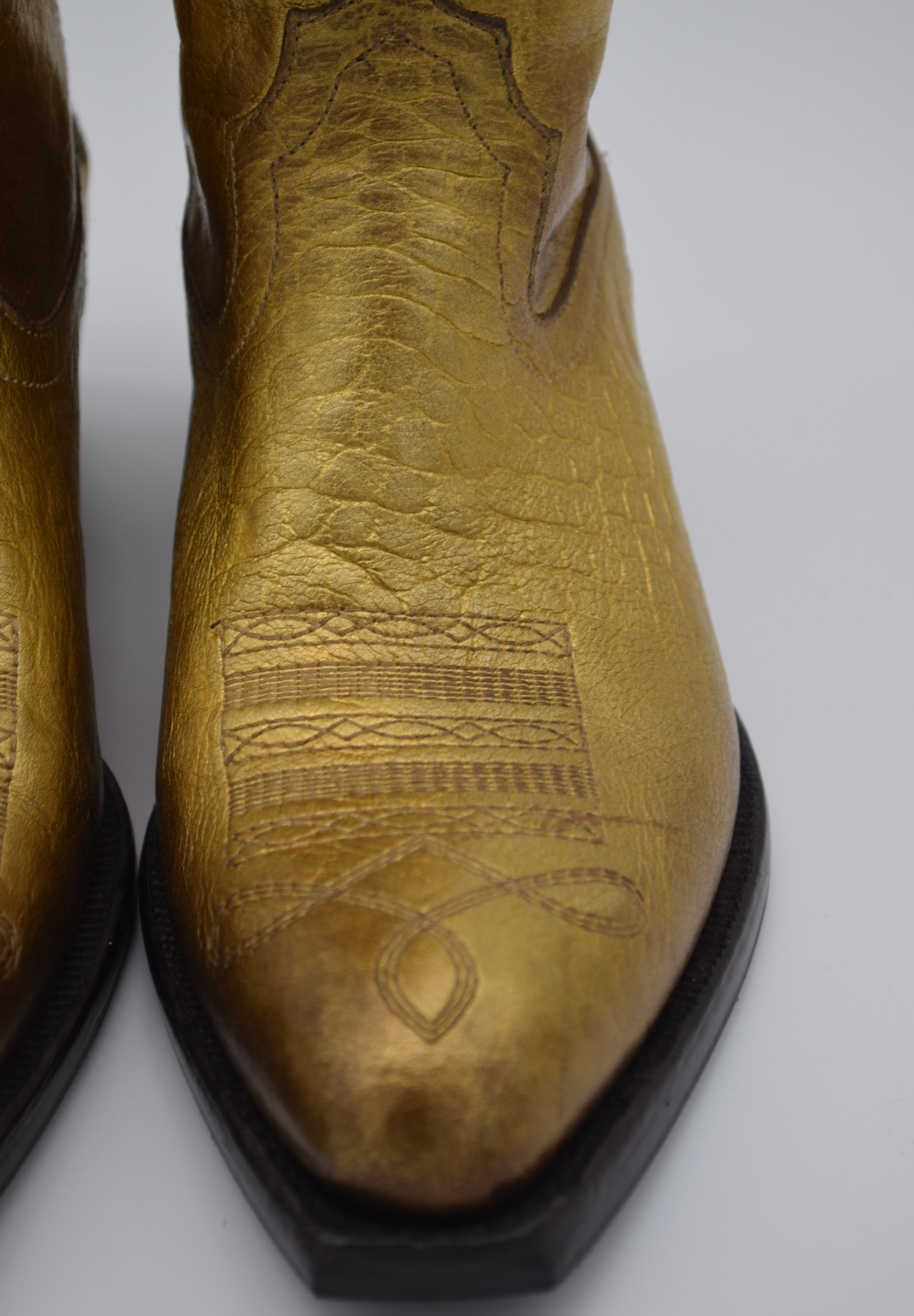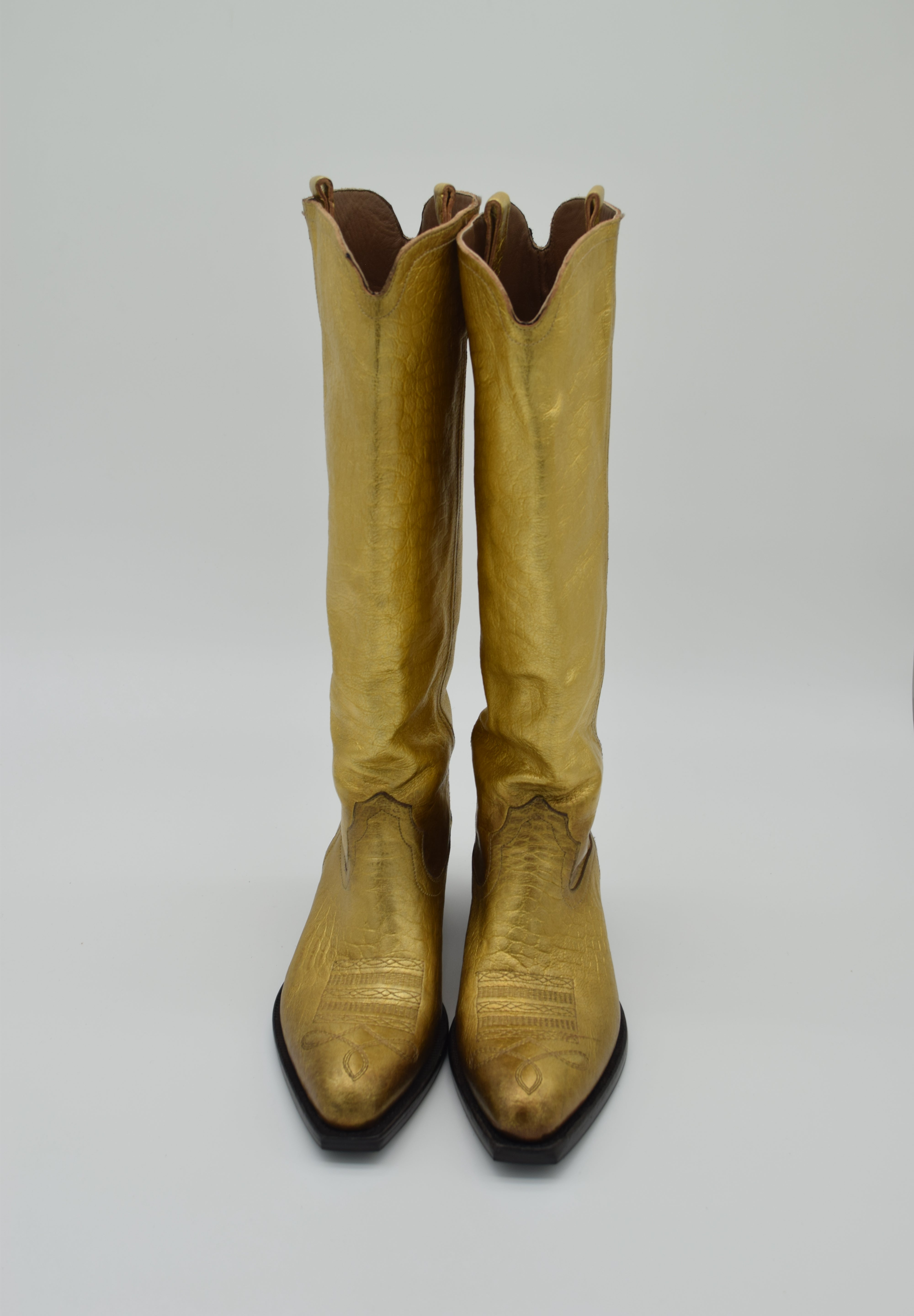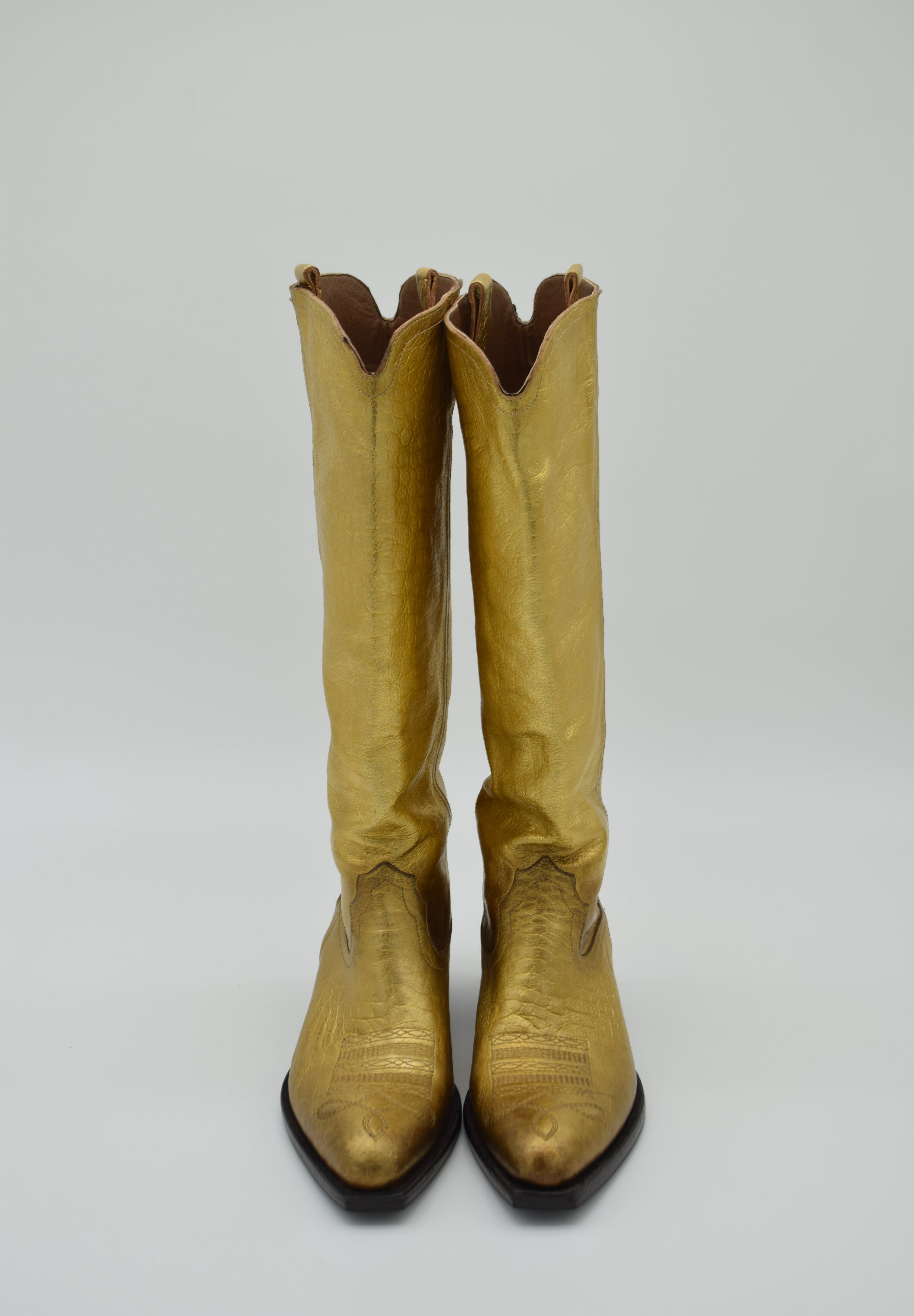Statement high knee boots from Alexander Hotto, expertly crafted in Italy from supple leather with a subtle metallic finish. Perfect for bold, stylish looks and transitional seasons. Available in a luxurious golden tone.