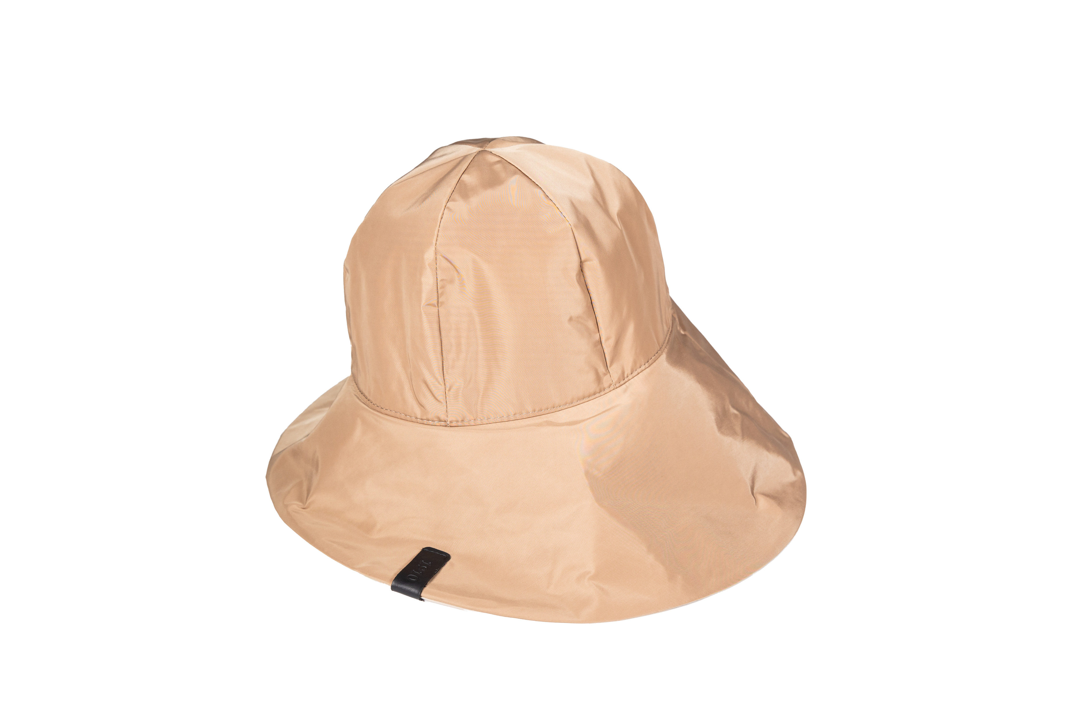 Asymmetrical cloche hat made from reversible nylon with a leather logo patch.