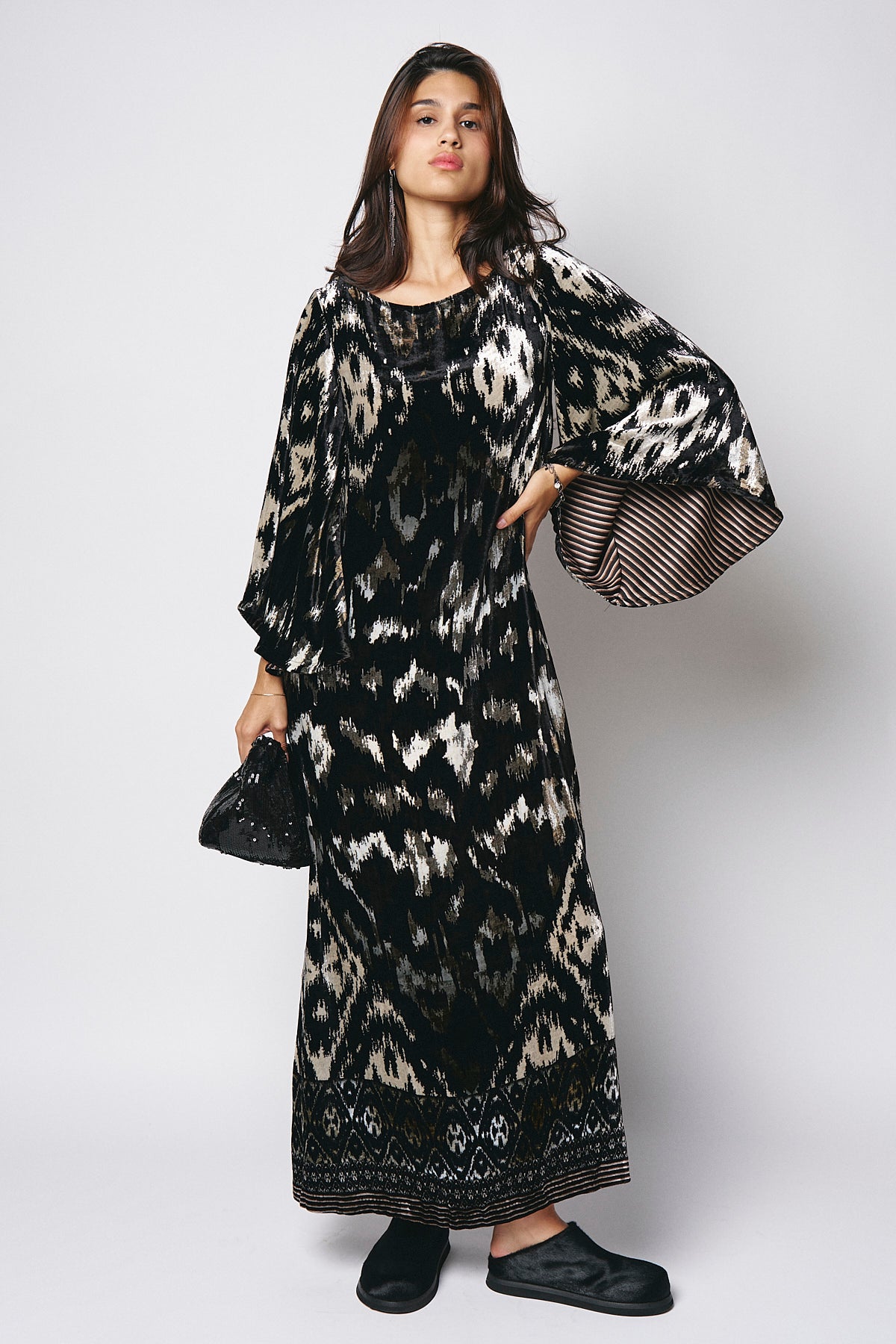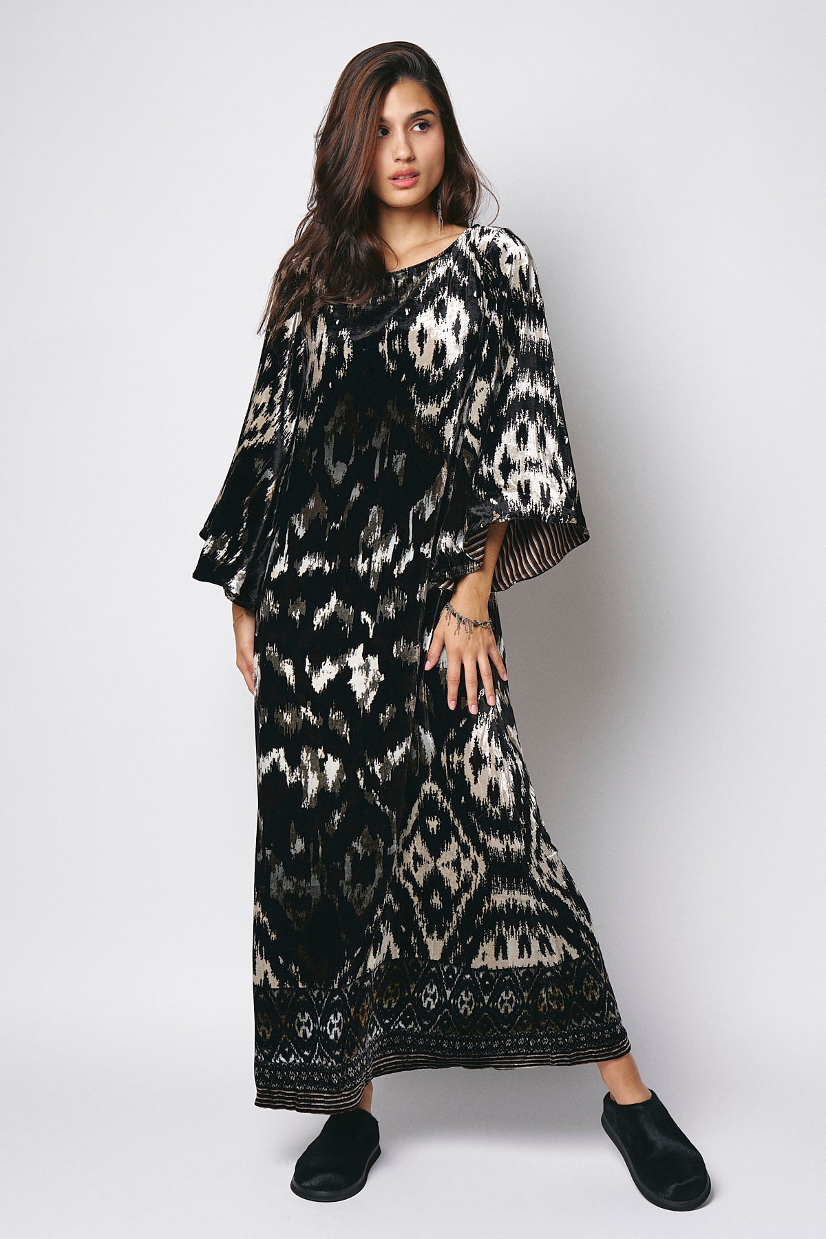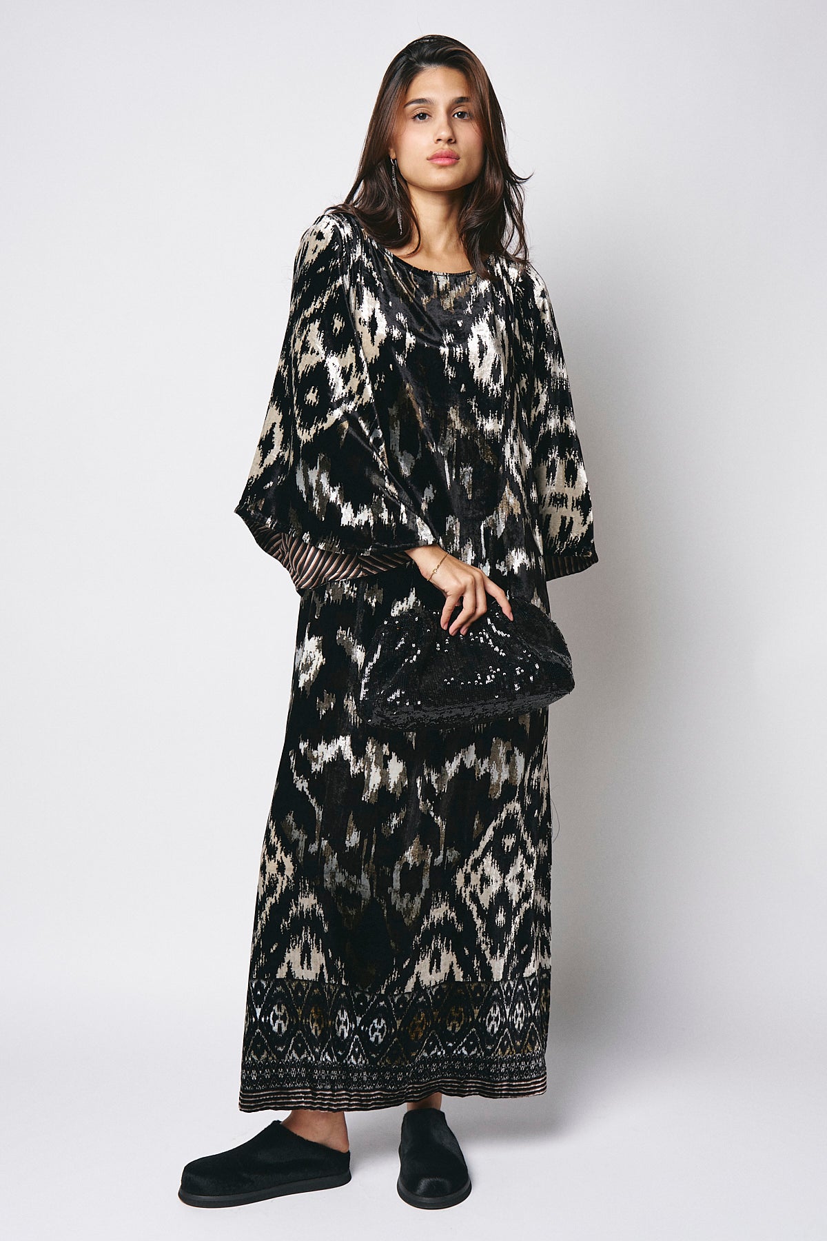 The Pierre-Louis Mascia Kanpur Dress is crafted in Italy from a silk-blend velvet with a bold, graphic print. Flowing sleeves and a relaxed silhouette make it a statement piece for both day and evening wear.