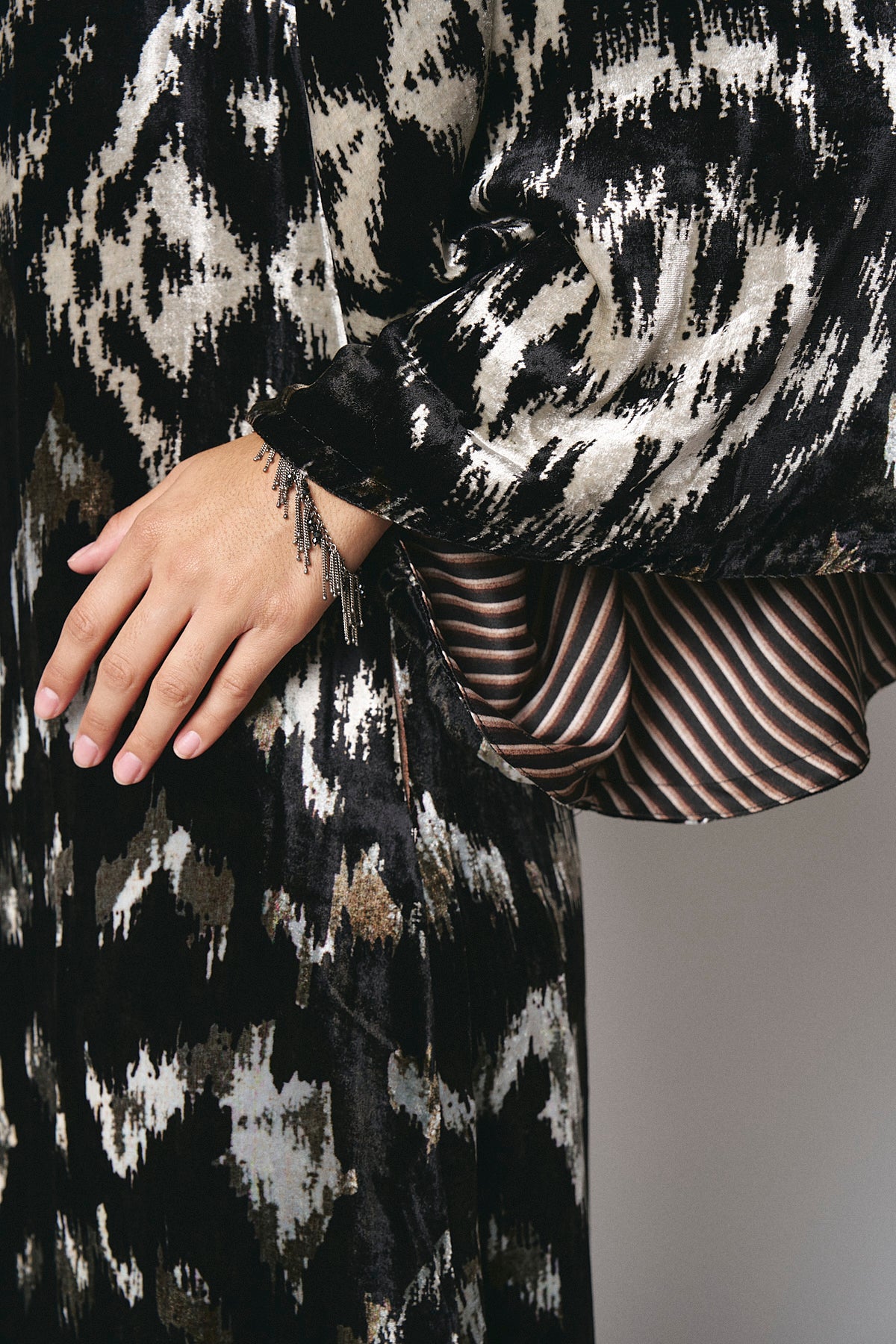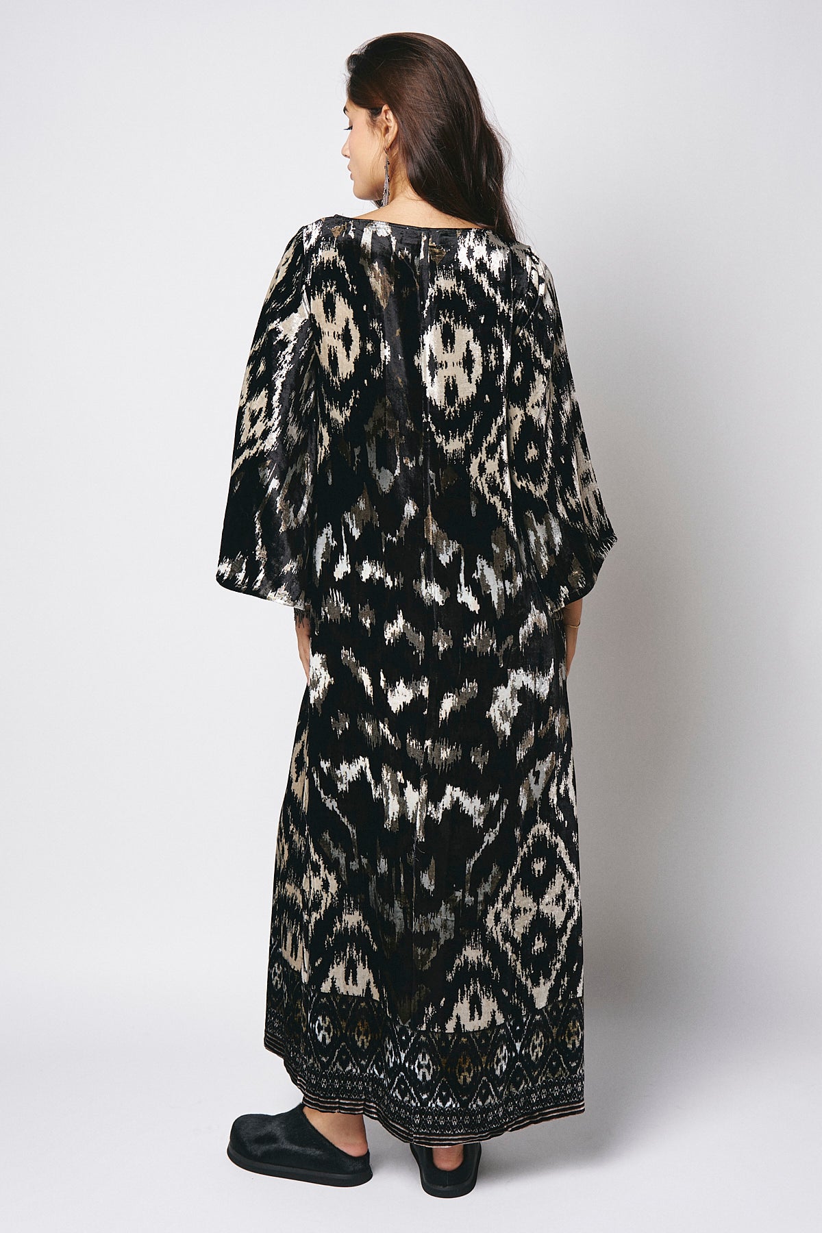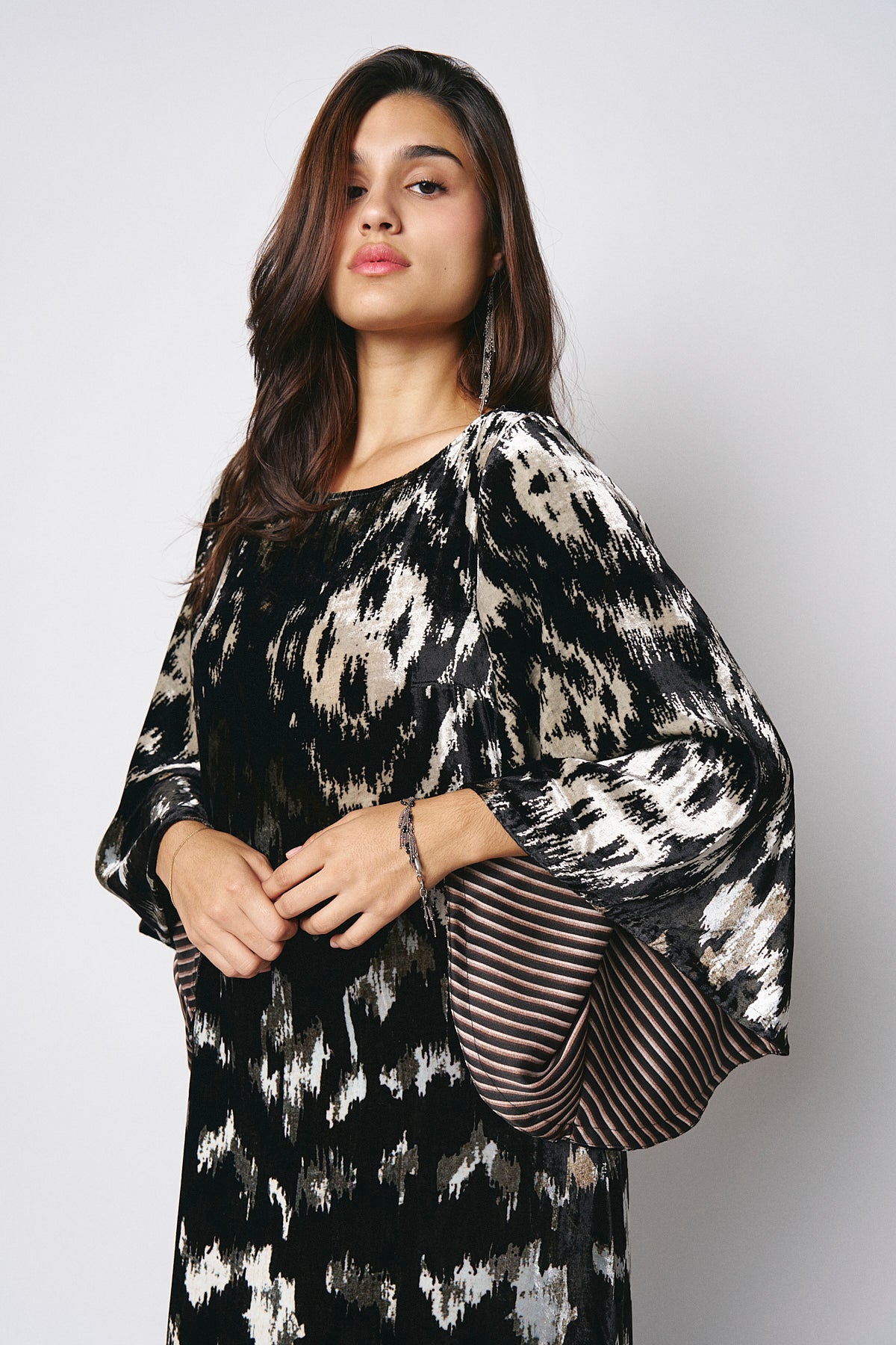 The Pierre-Louis Mascia Kanpur Dress is crafted in Italy from a silk-blend velvet with a bold, graphic print. Flowing sleeves and a relaxed silhouette make it a statement piece for both day and evening wear.