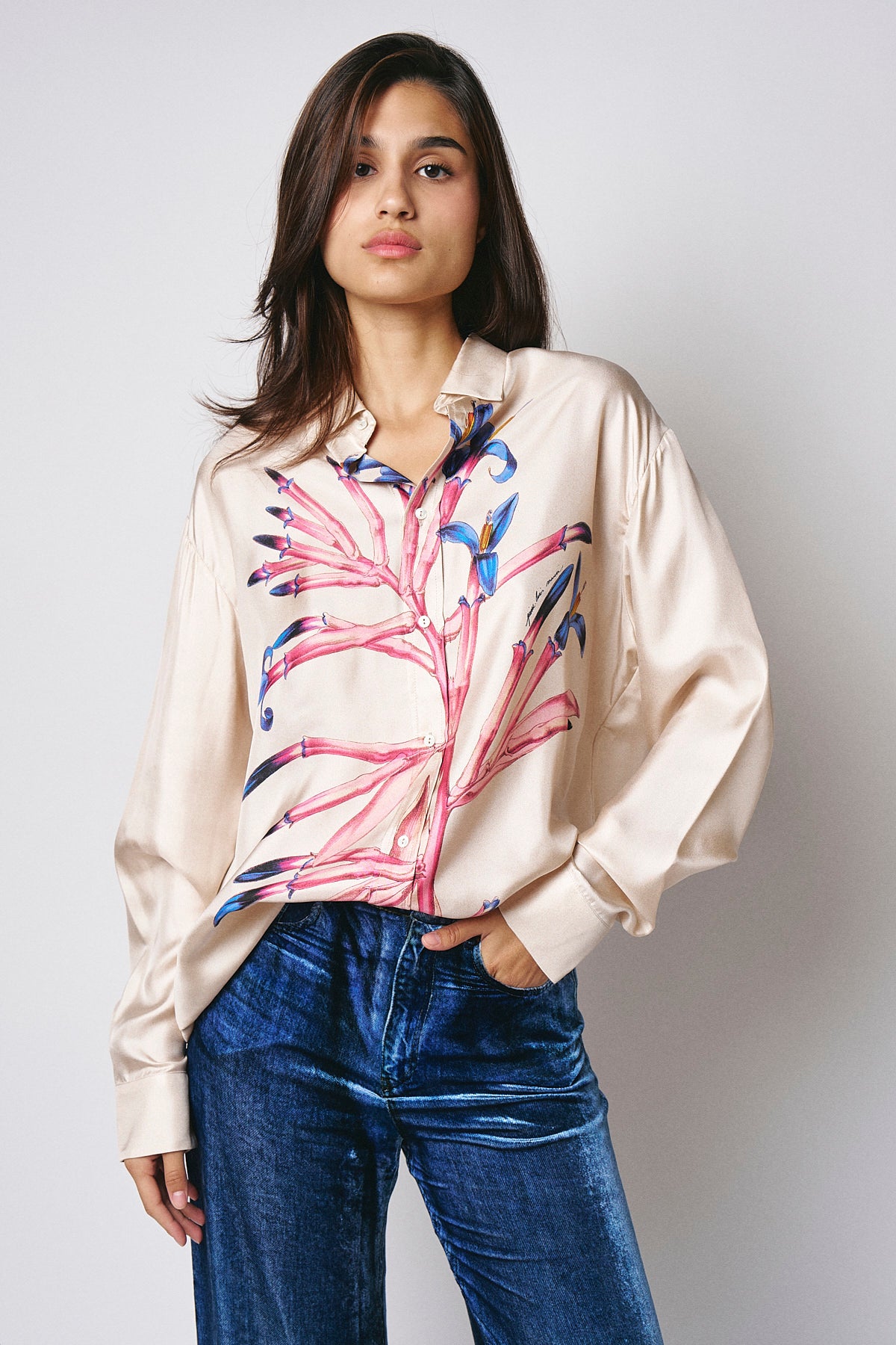A lightweight silk shirt in a relaxed fit, featuring a vibrant floral print. Made from 100% silk, it blends luxury and comfort, bringing a striking accent to any look.