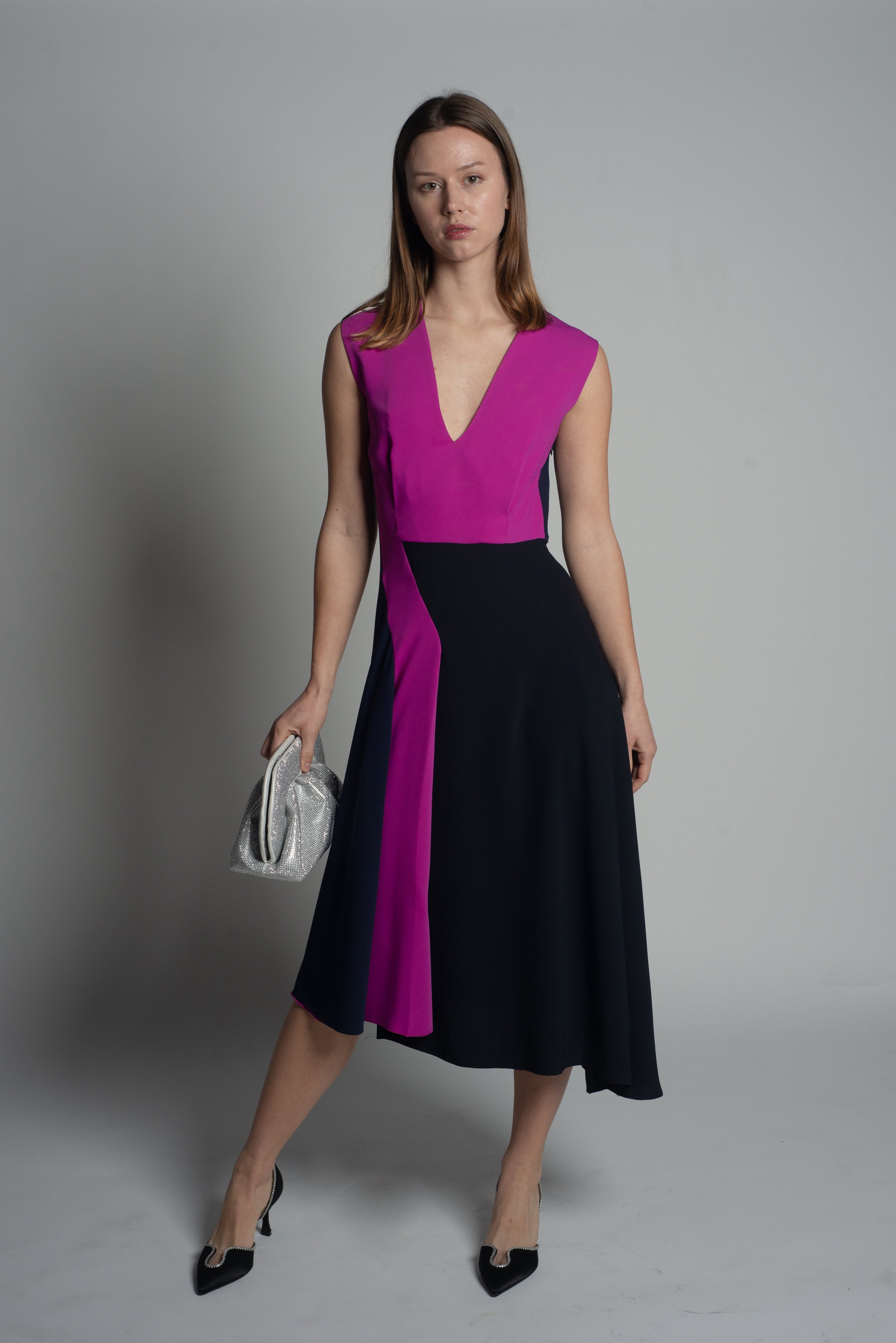 Elegant midi dress by Juan Vidal with a bold fuchsia and black color block design and a flattering V-neckline.