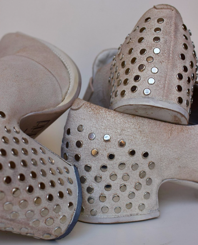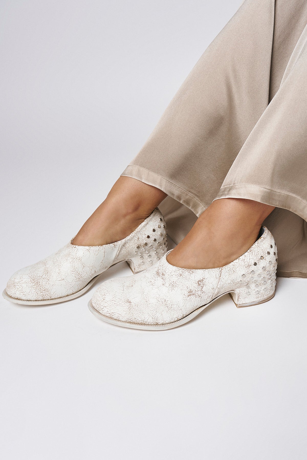 The Apice Studded Low-Heel Shoes are a bold yet refined take on modern footwear. Crafted in Italy from cracked-effect white leather, they feature a sculptural low heel accented with metallic studs for a subtle edge.