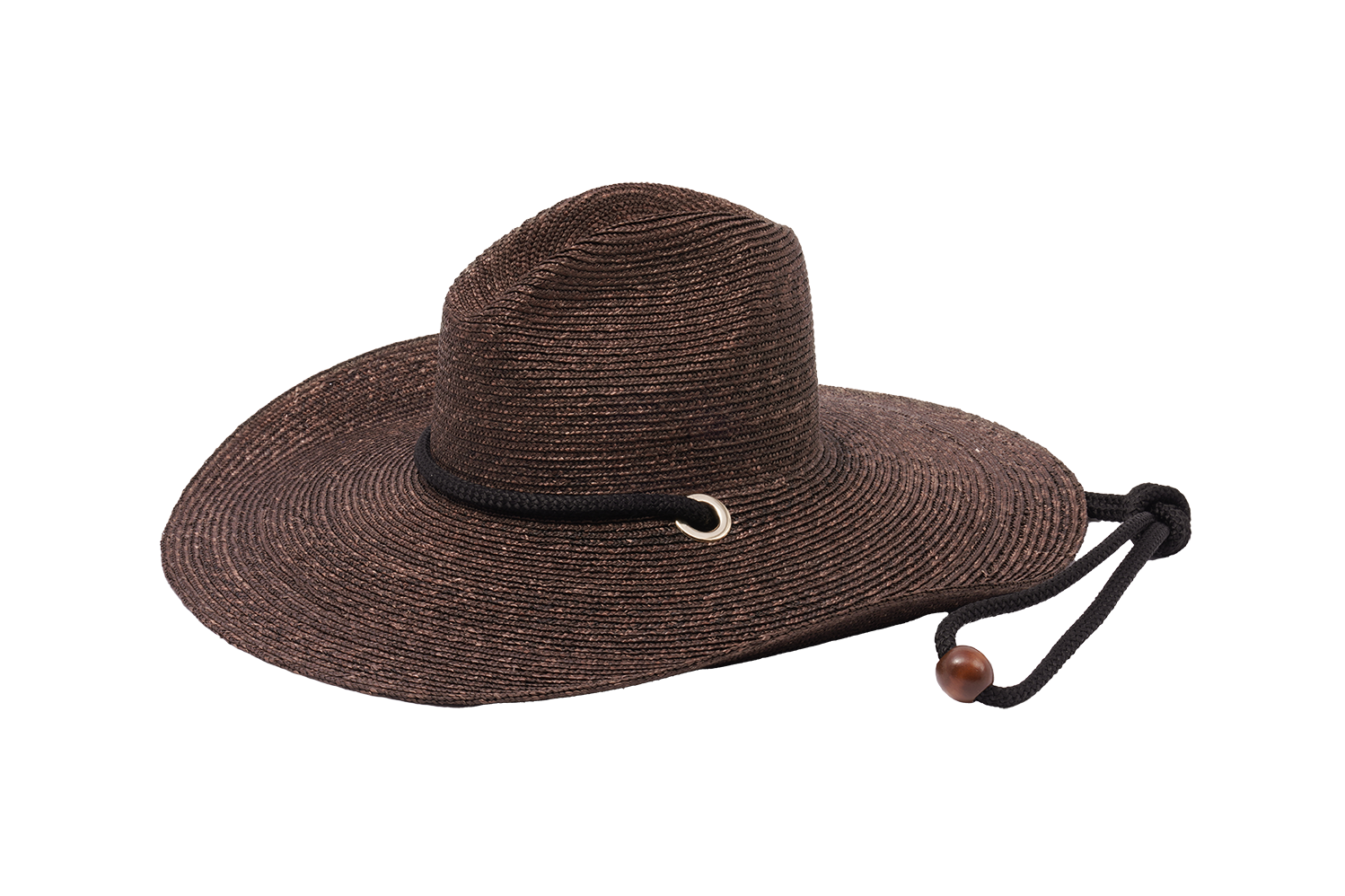 A wide-brim hat in deep brown with a structured crown and an adjustable chin cord. Stylish, protective, and ideal for outdoor adventures or sophisticated summer looks.
