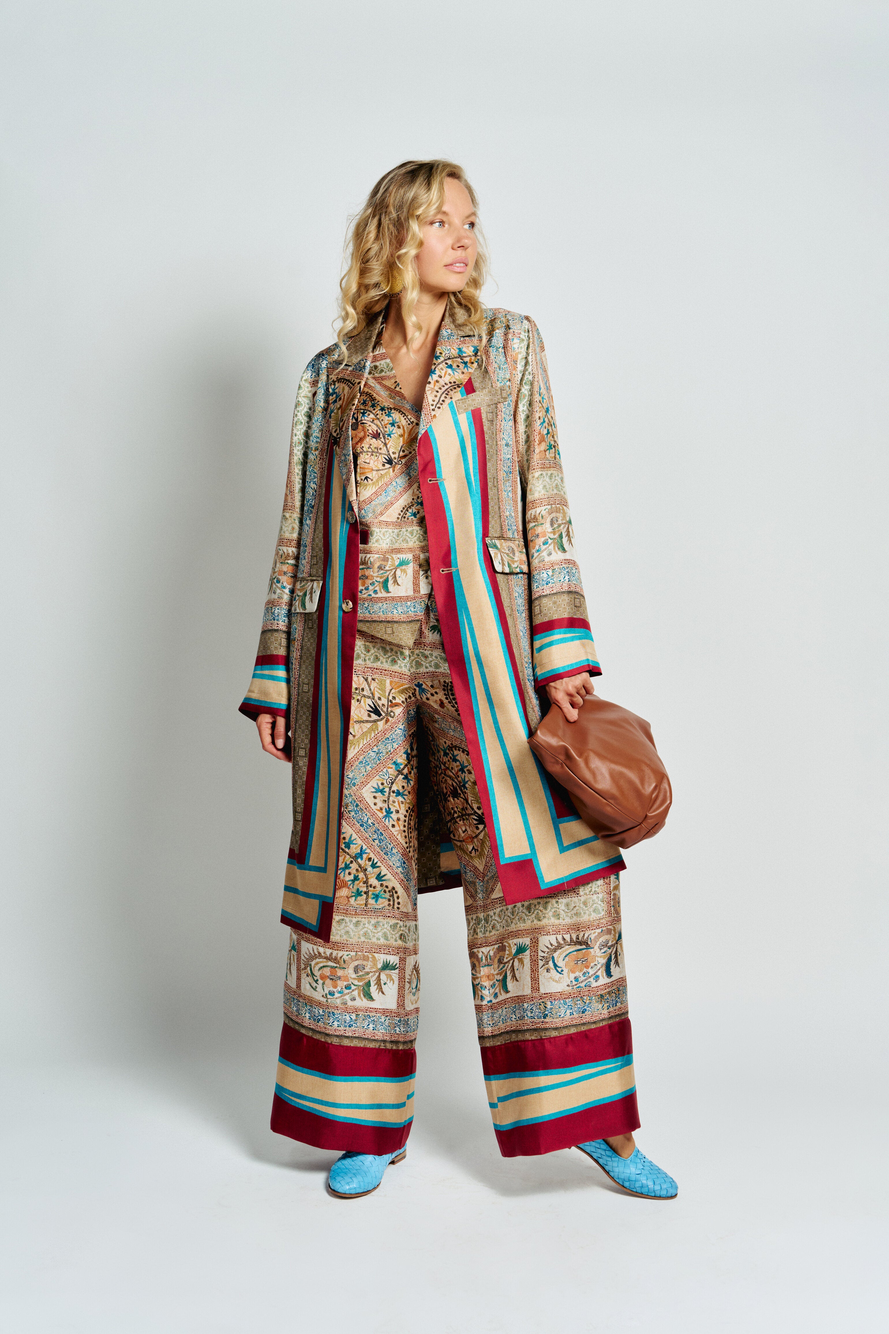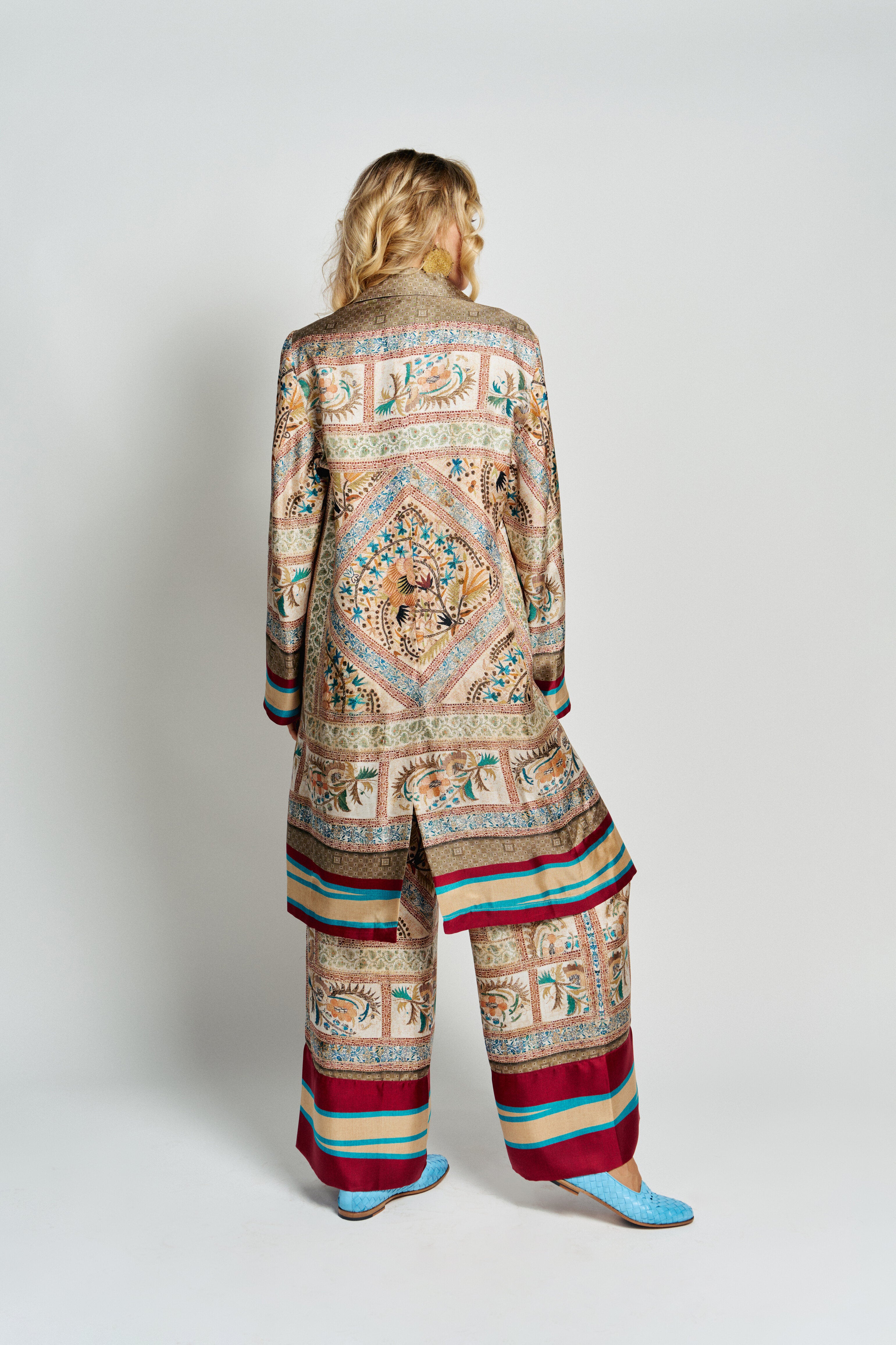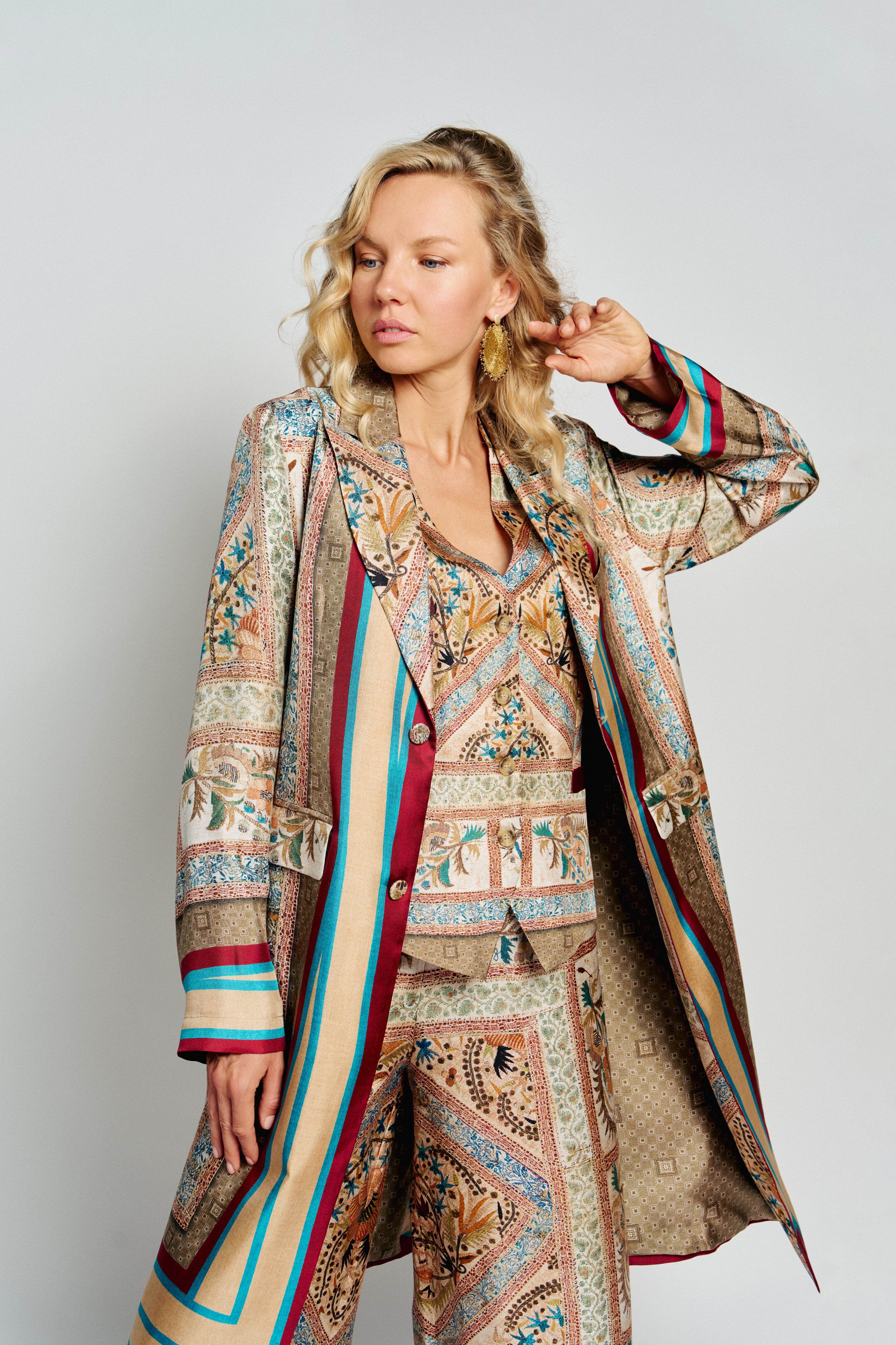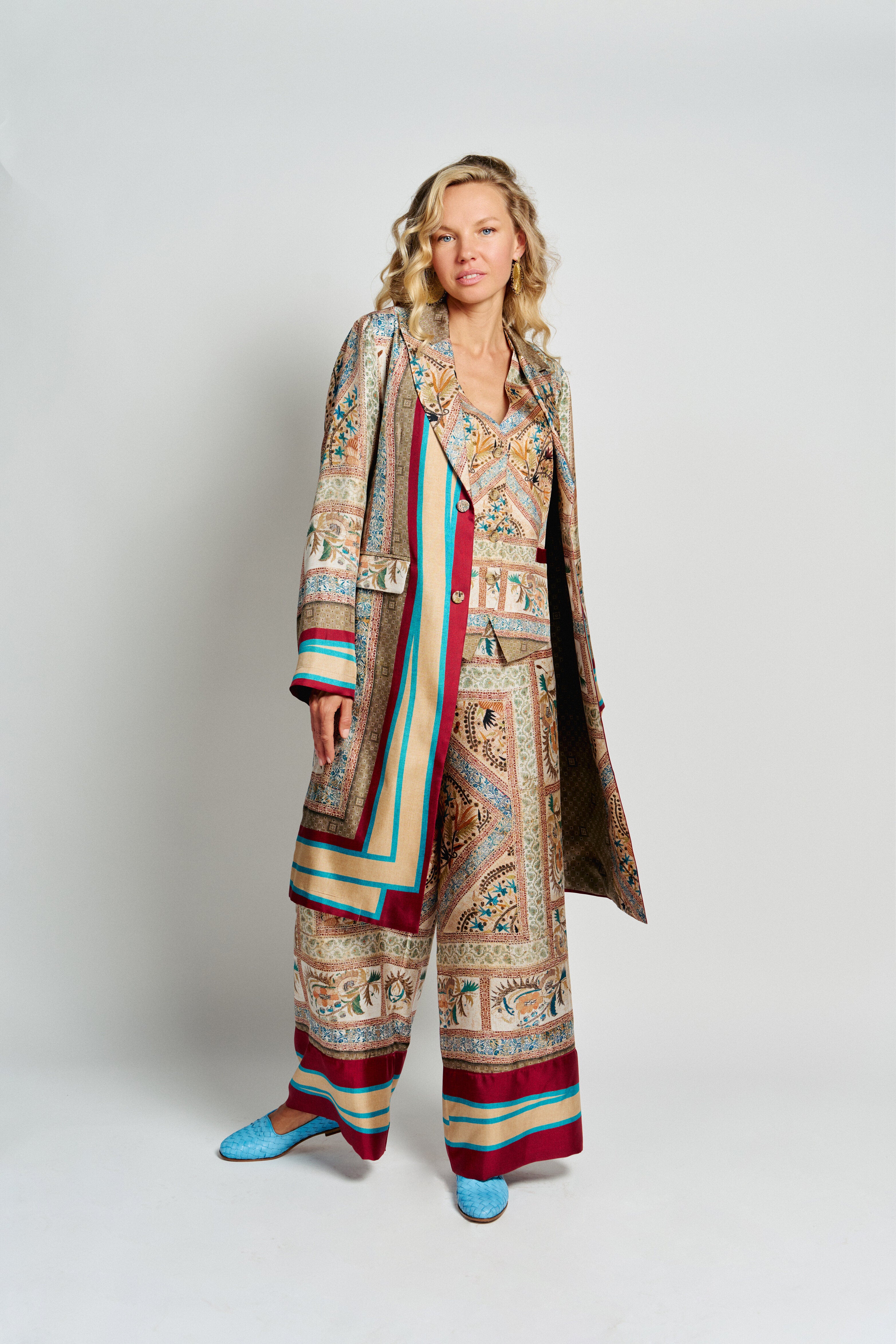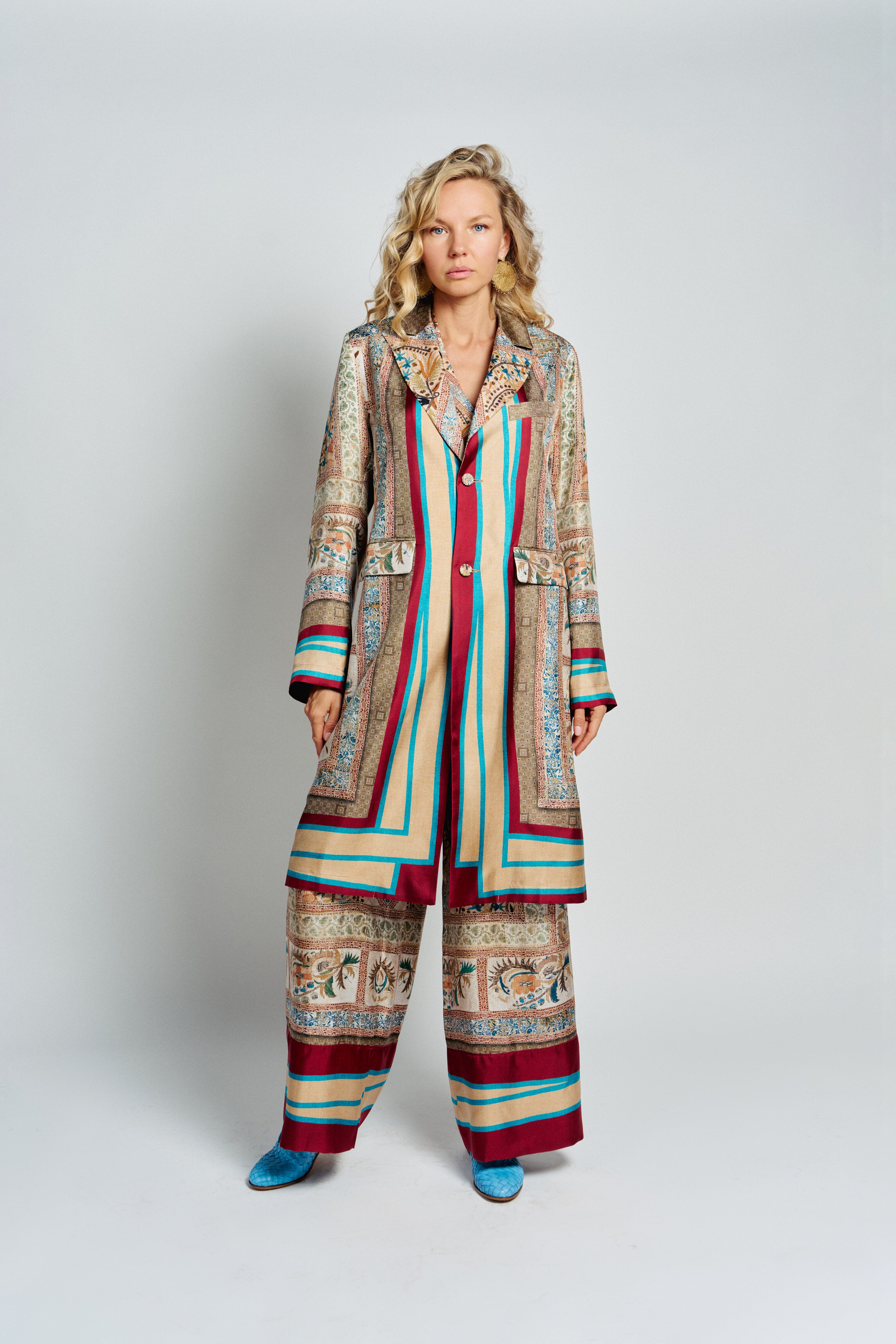 A statement long coat blending timeless tailoring with artful prints. With its sharp lapels, rich color palette, and tapestry-inspired design, it adds instant sophistication to any look — whether worn solo or styled with matching patterns.