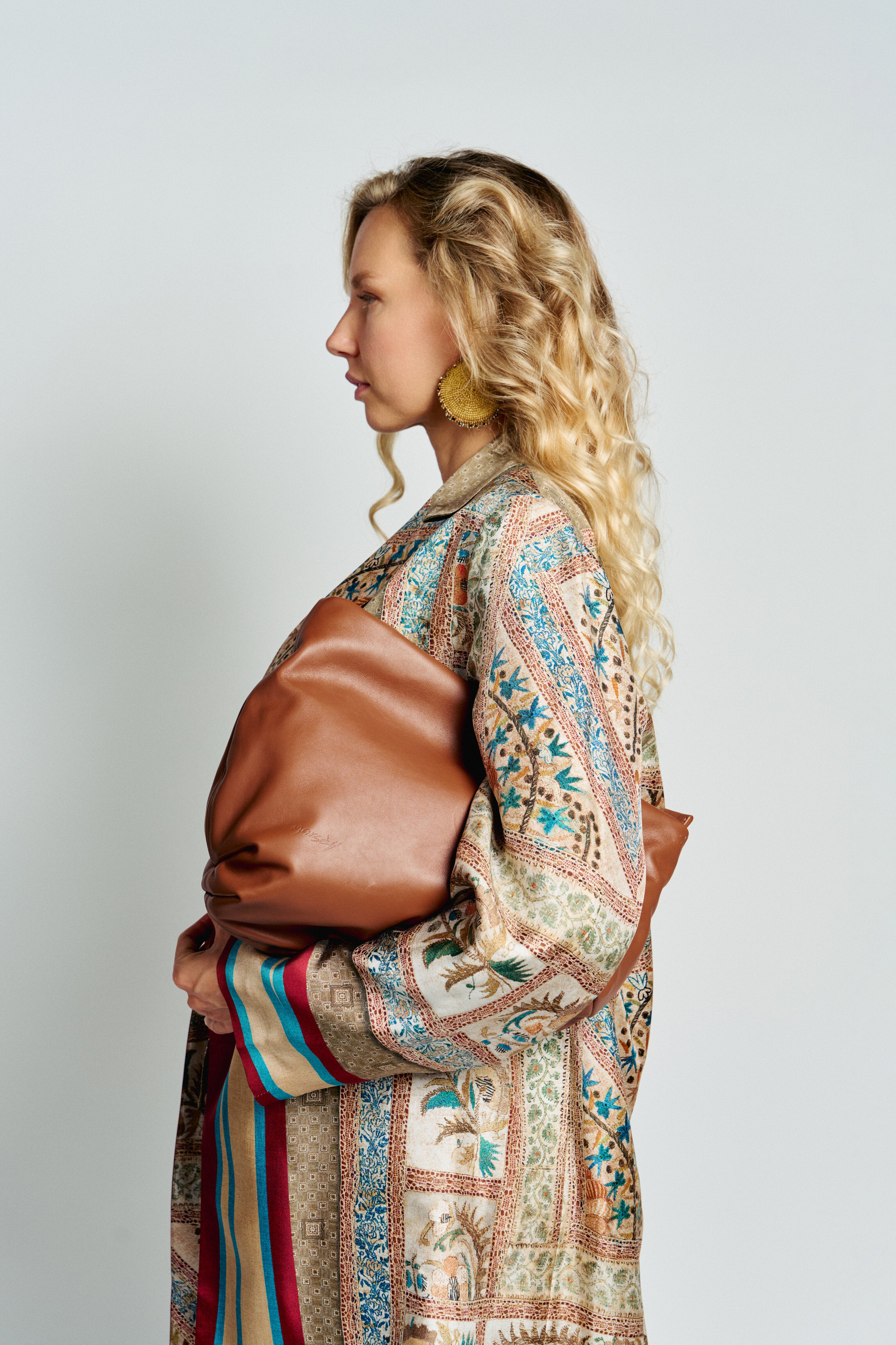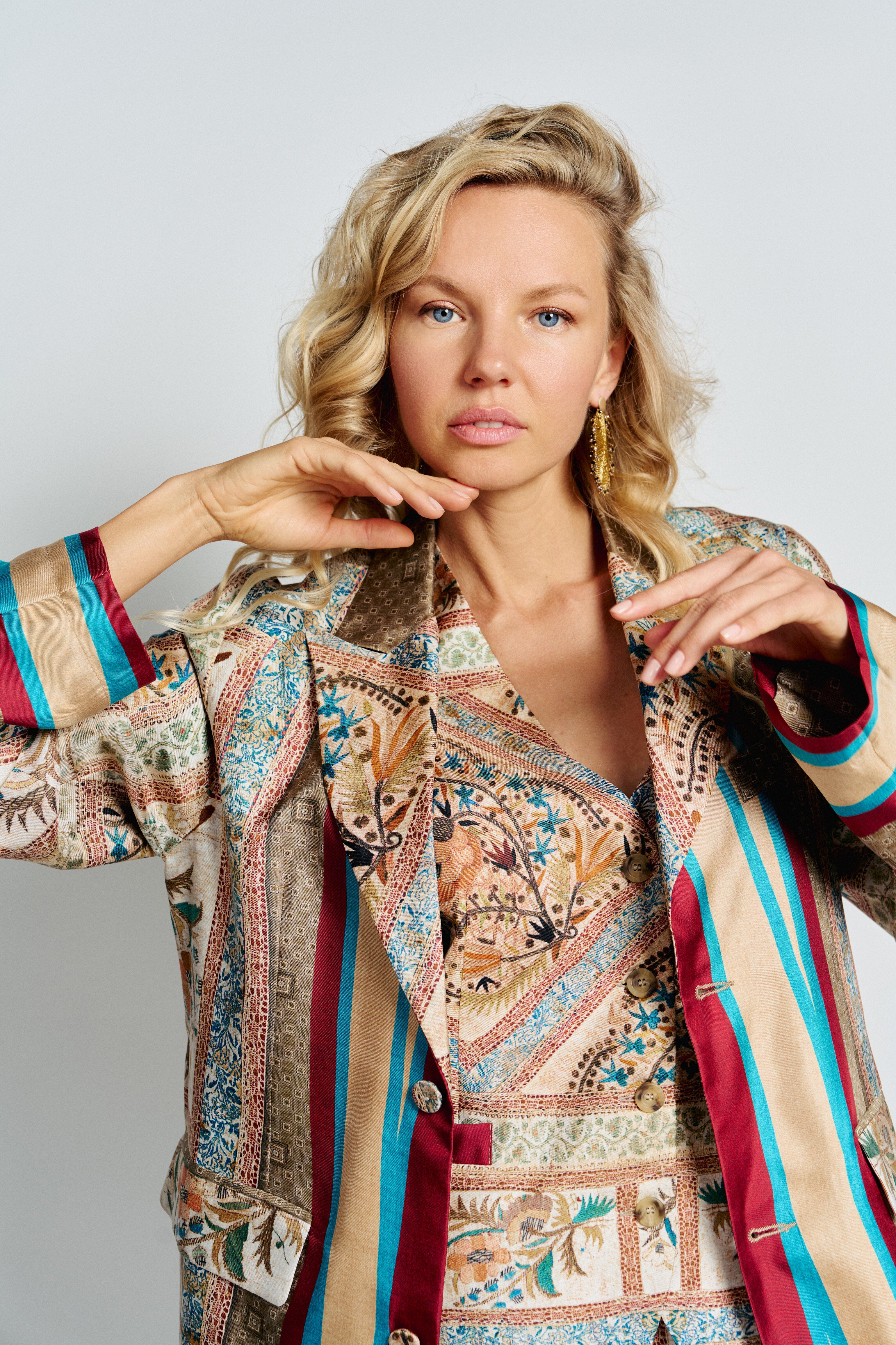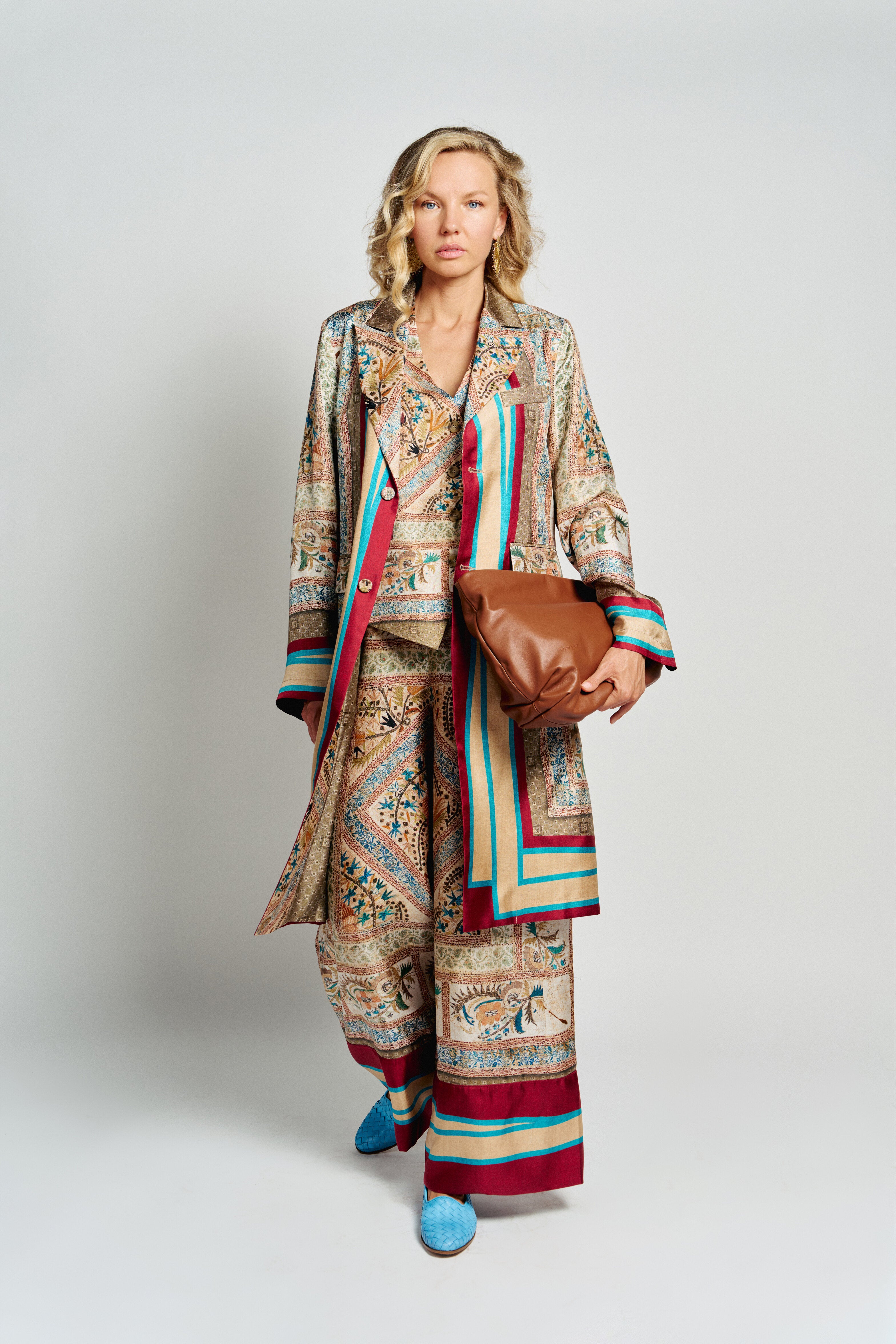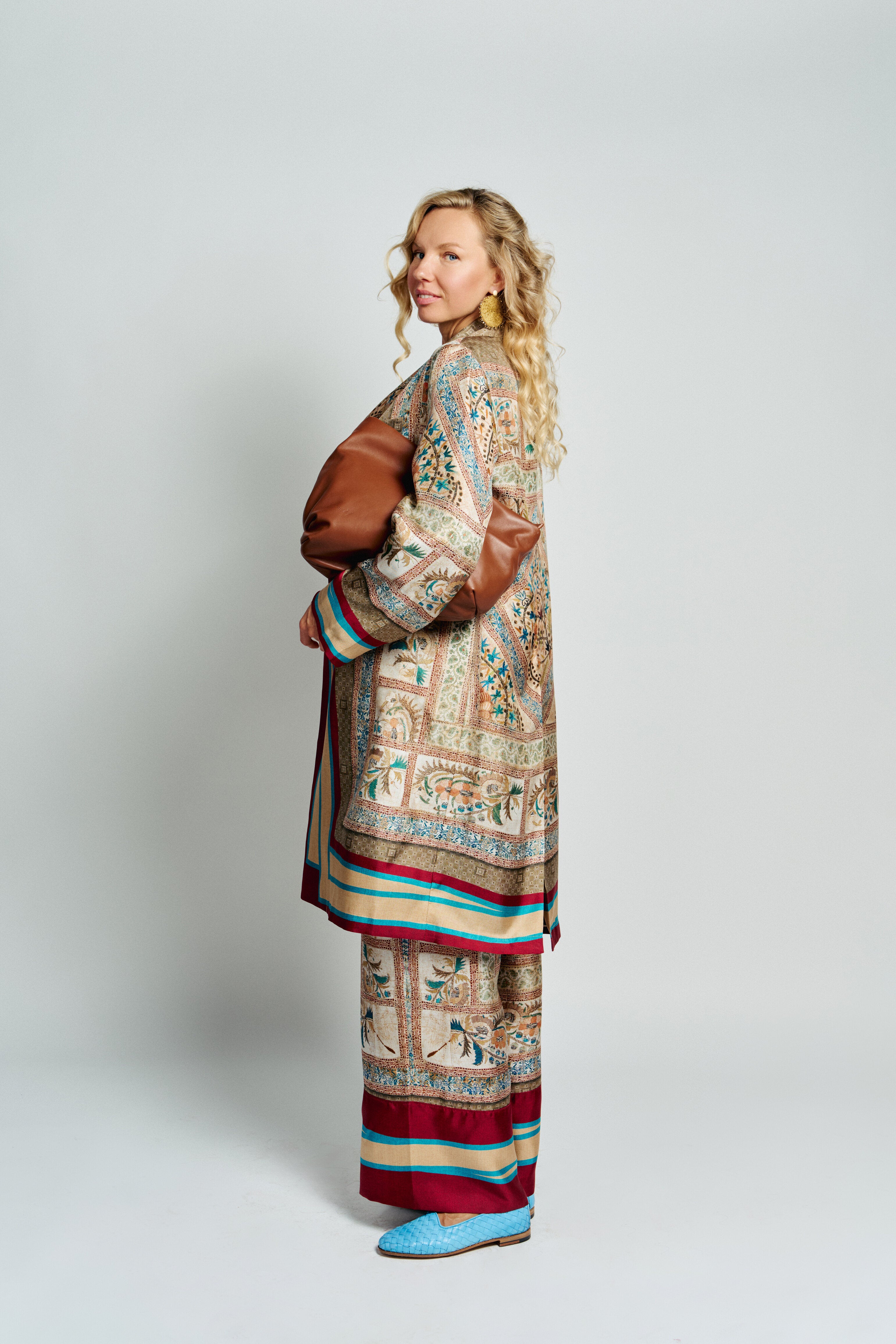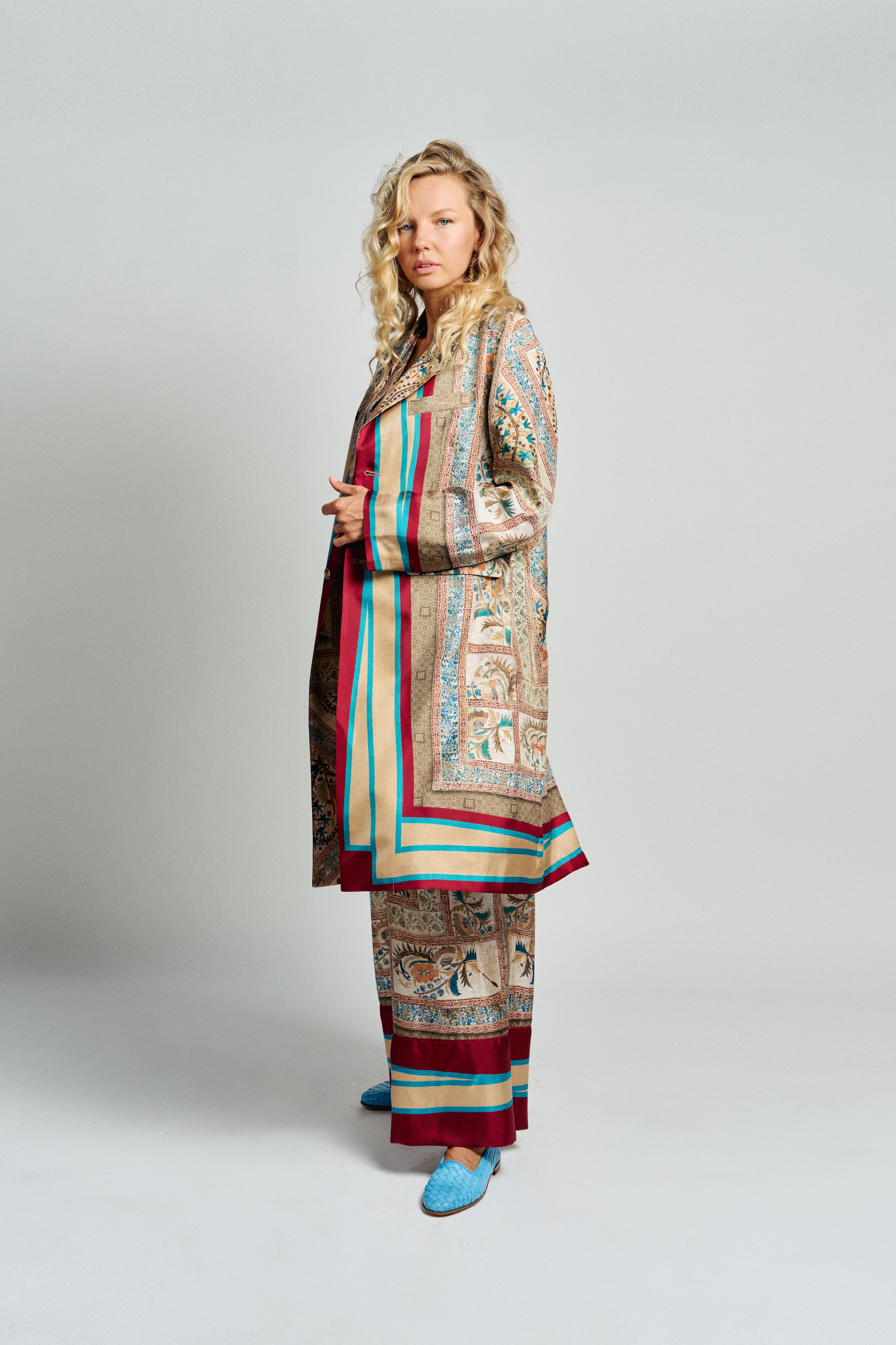 A statement long coat blending timeless tailoring with artful prints. With its sharp lapels, rich color palette, and tapestry-inspired design, it adds instant sophistication to any look — whether worn solo or styled with matching patterns.